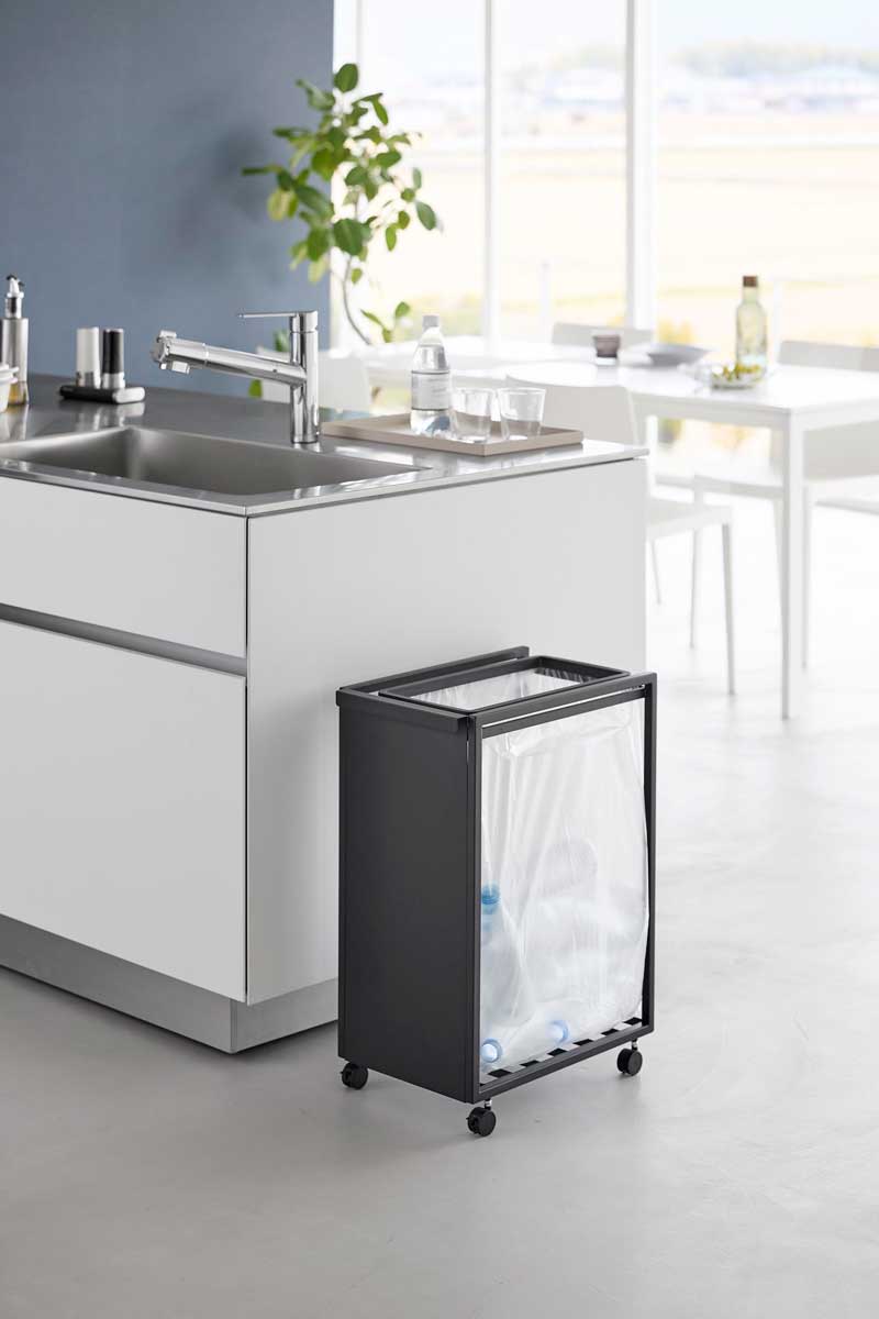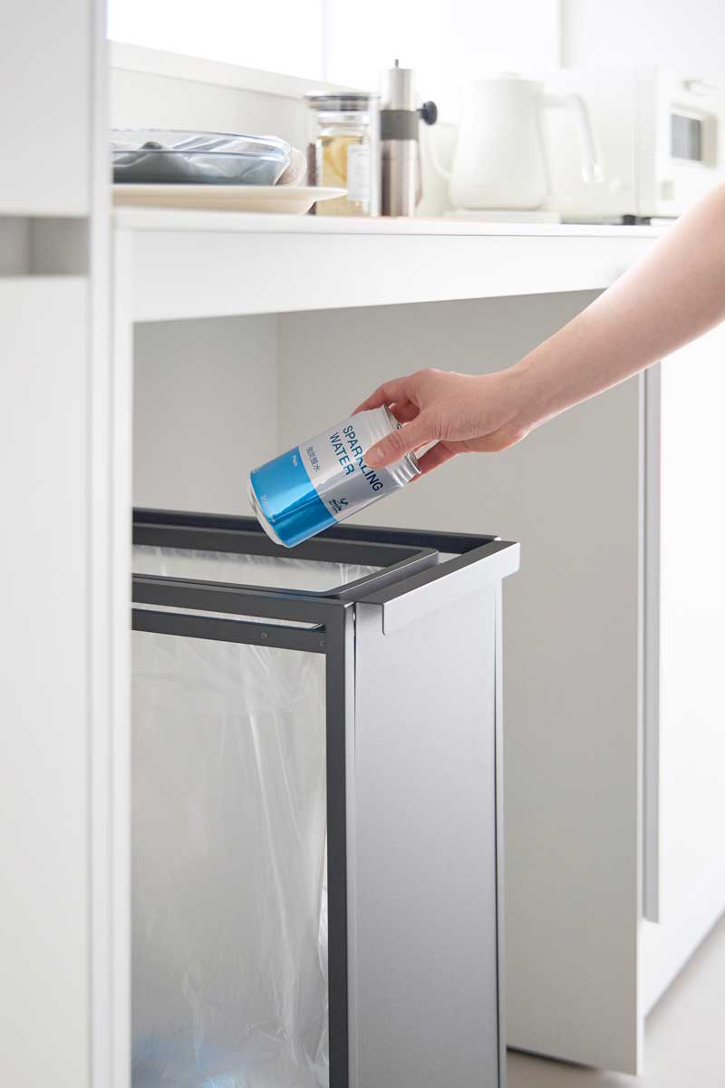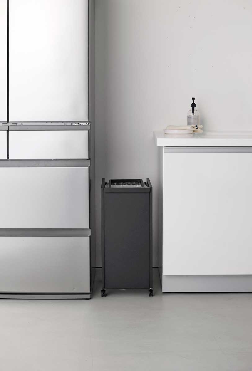 キッチン横はもちろん、冷蔵庫横の隙間にも設置できるスリム設計で、ゴミをサッと捨てやすく便利。ゴミ袋の取り替えも簡単。ストッパーを外して手前に引き出すだけで、スムーズに取り出せます。ハンドル付きで移動しやすく、底面にはゴミ袋のストックを収納できます。