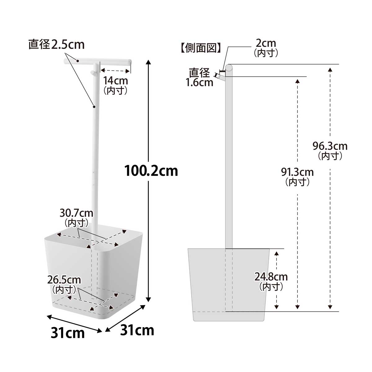 ・内寸サイズ:約W140xD25xH25mm(ハンガー片側あたり)/約W265xD265mm(バスケット底部)/約W307xD307mm H24.8cm(開口部)/約W16xD20mm(フック)