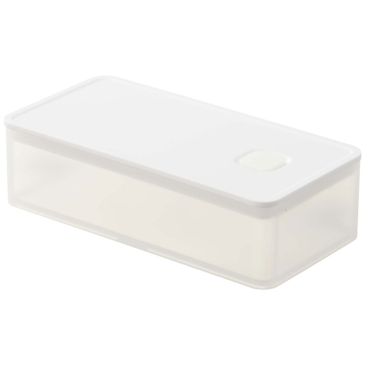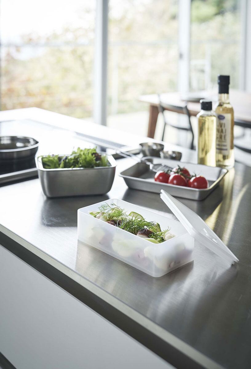 ランチボックスとしても使える食材の保存容器。本体はバルブをワンプッシュで簡単密閉。パッキン付きで汁もれしにくい構造になっています。また、食器洗い乾燥機、電子レンジにも対応しています。
