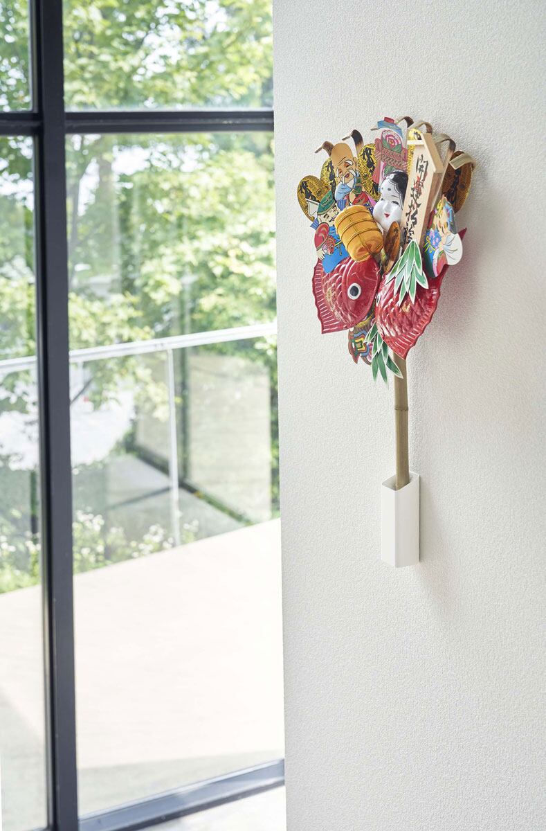 壁に簡単固定できる、TOWER 熊手&福笹ホルダー。付属の石こうボード用プッシュピン・木ネジで本体を固定、上部は留め具で固定するだけで、お好きな位置に付けることができます。飾る場所に困る七夕の笹飾りやドライフラワーにも使用できます。