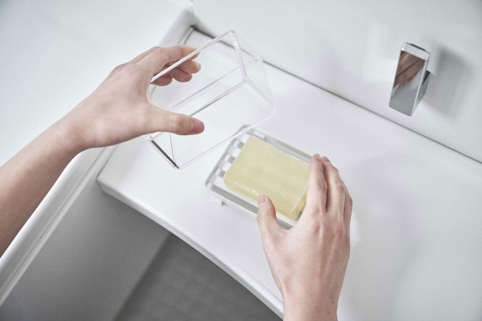 石けんを水滴から守り、清潔に長持ちさせるカバー付きのソープトレー。水滴によって石けんが溶けるのを防ぎ、清潔で快適に保ちます。また、シリコーンクッション付きで設置面を傷めません。