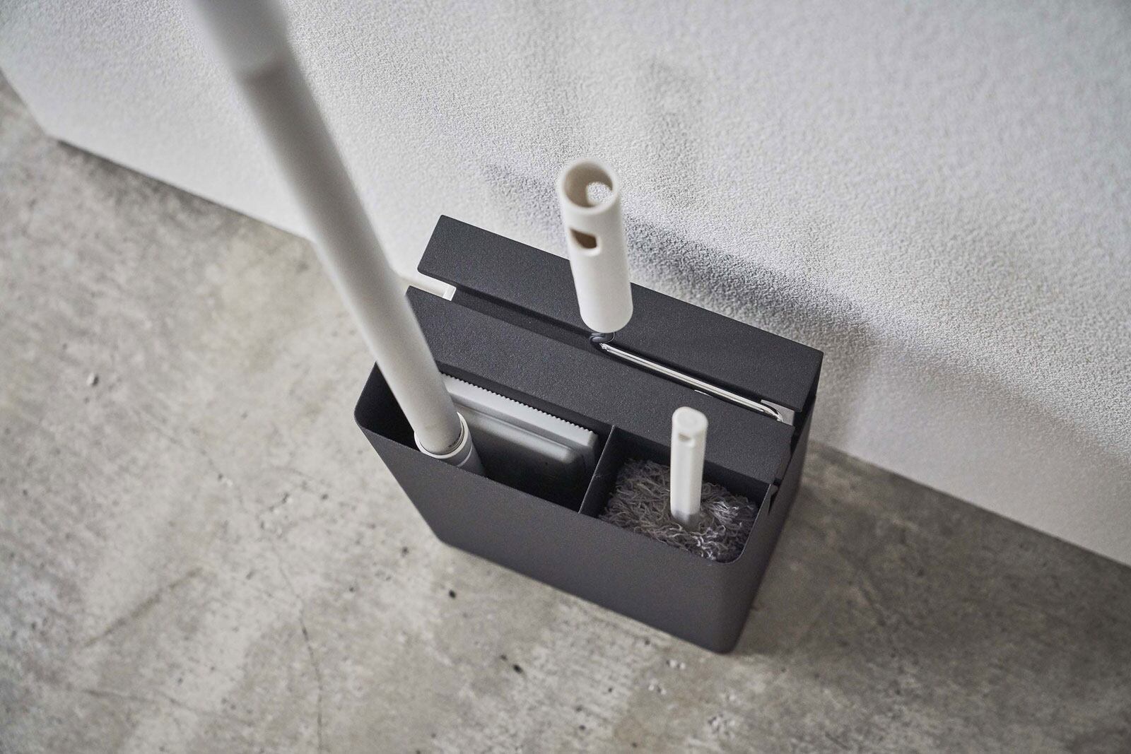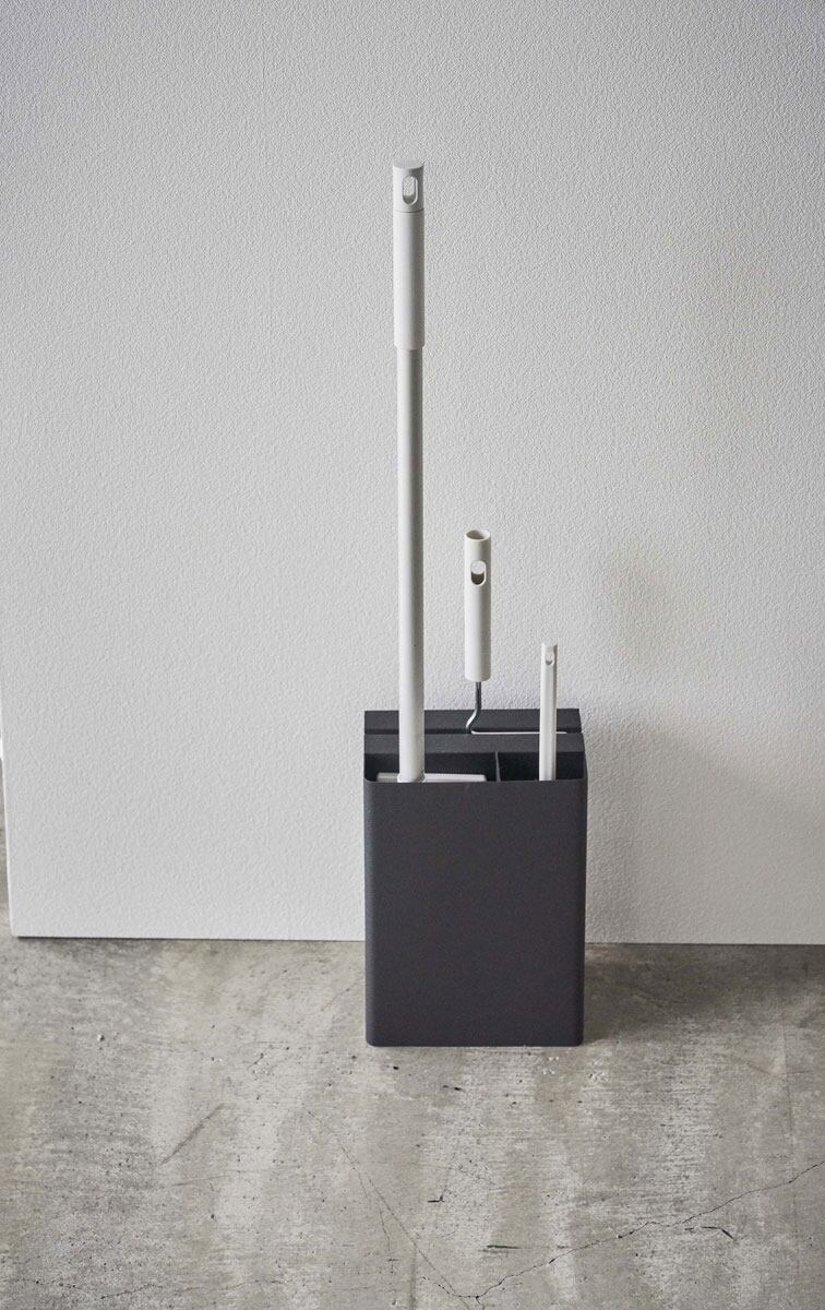 お掃除ツールを隠して一括収納できる便利なスタンド。スタイリッシュだからリビングやサニタリー、廊下などでも主張しすぎず、置き場所に困らない美しい佇まいのデザインです。