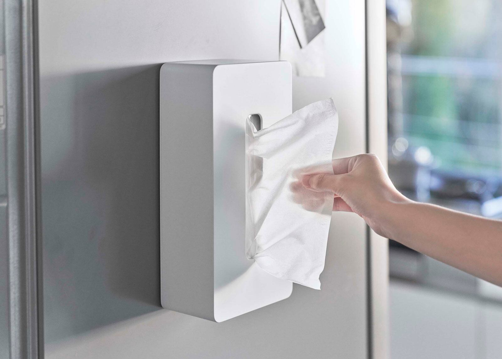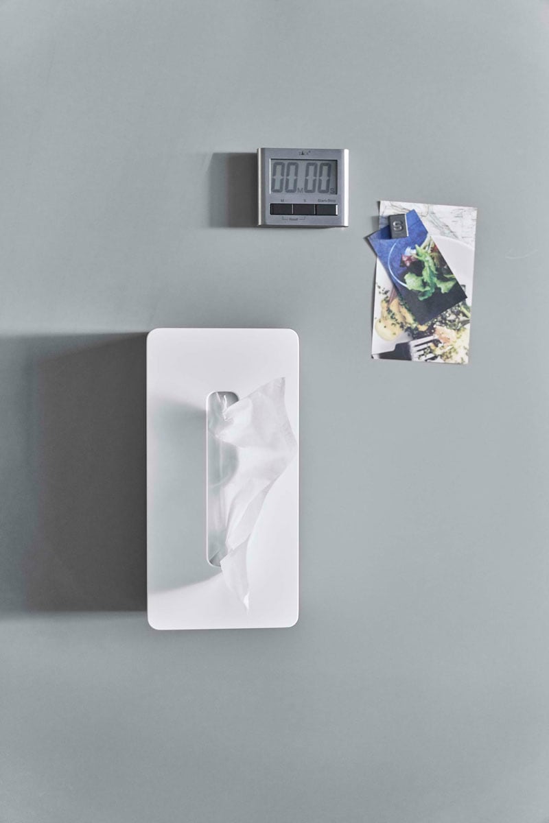 高さ約7cmまでの一般的なティッシュボックスが入るシンプルなデザインのティッシュケース。強力マグネットで、冷蔵庫横などに簡単取り付けできます。ボックスタイプのポリ袋なども収納可能です。
