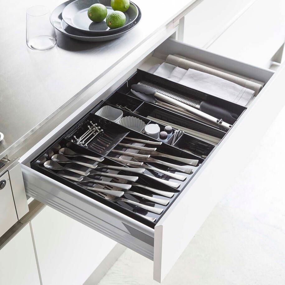 引き出しのサイズに合わせて横に6cmごとに伸縮できるカトラリー収納ケース。3種類の仕切りで引き出しの中を自分仕様にカスタマイズできます。本体には、仕切りを約2cmごとに調整できる溝が付いています。