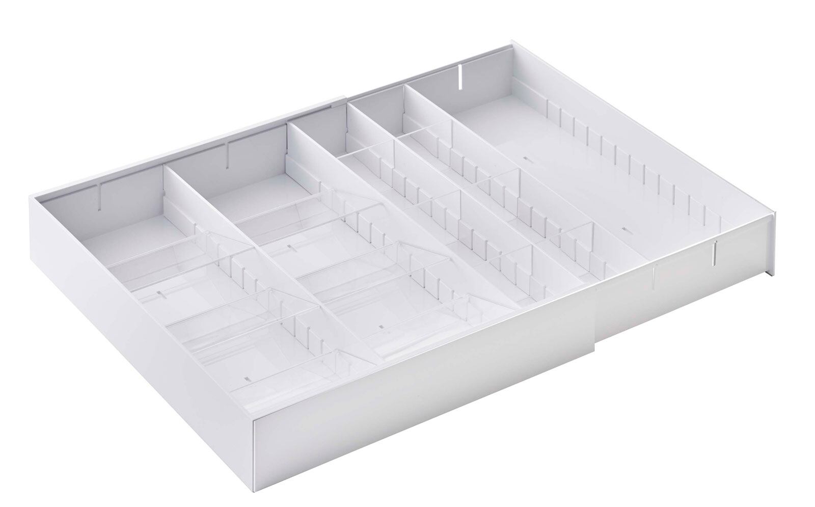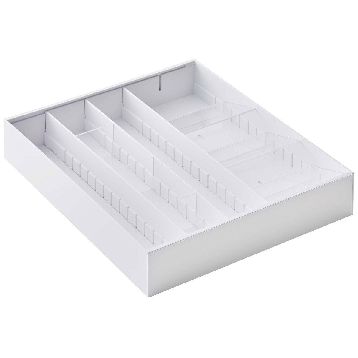 引き出しのサイズに合わせて横に6cmごとに伸縮できるカトラリー収納ケース。3種類の仕切りで引き出しの中を自分仕様にカスタマイズできます。本体には、仕切りを約2cmごとに調整できる溝が付いています。