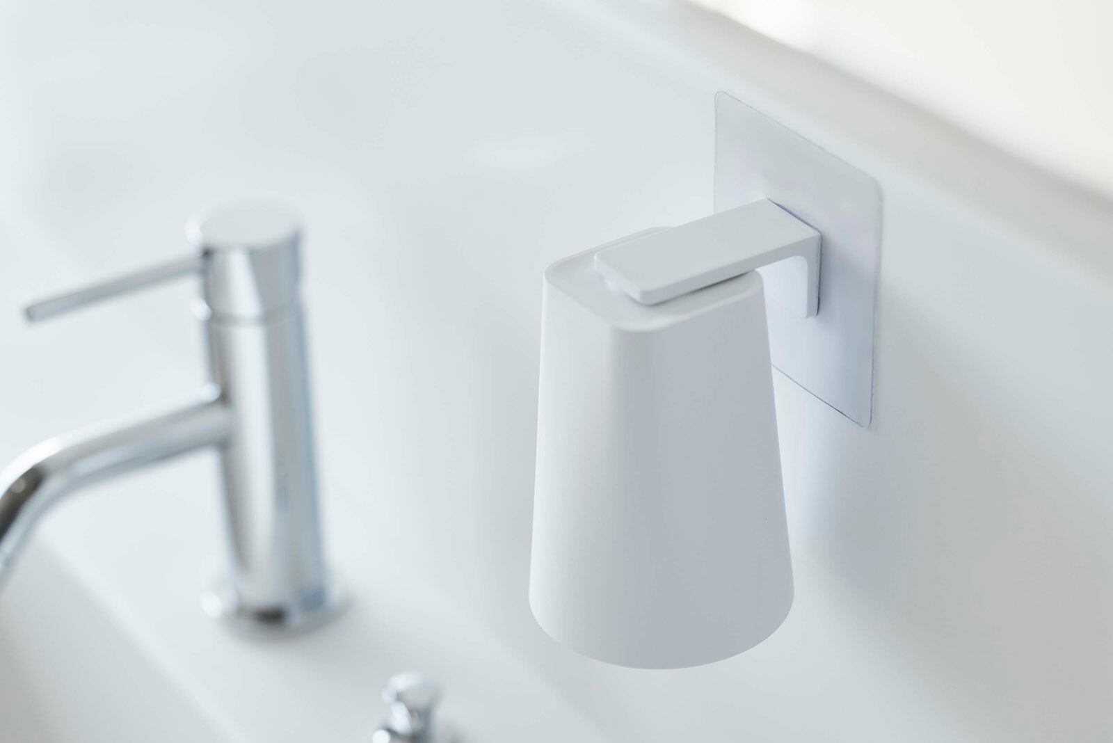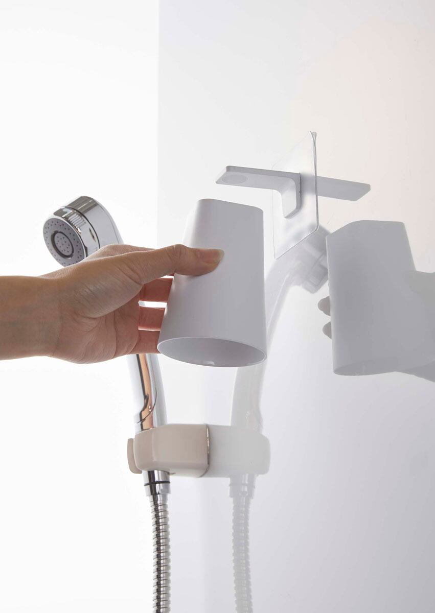 使いやすい位置に、タンブラーをマグネットで浮かせて収納する、TOWER(タワー)フィルムフック マグネットタンブラー。ホルダーは浴室のタイル面や洗面壁面などにフィルムフックで簡単取り付け。マグネットが付く壁面にタンブラーを直接収納することもできます。