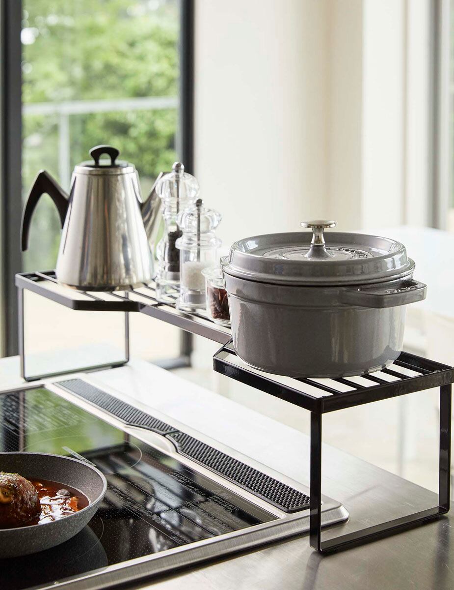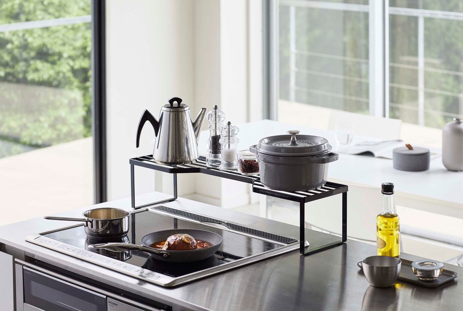 排気口カバーの上から設置できるコンロ奥ラック。脚部にはシリコーンが付いていて、キッチンをキズつけません。本体は高さがあるので、グリル使用時に排気口カバーの移動も簡単です。