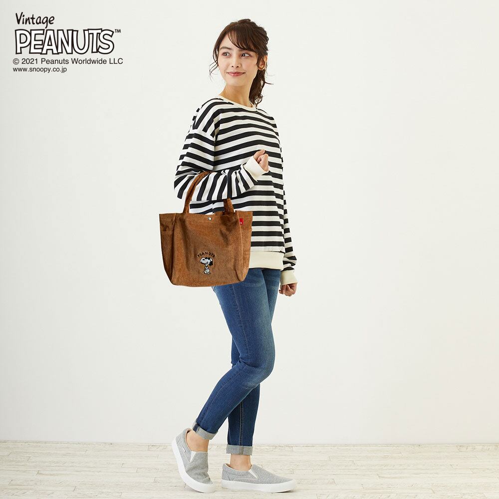 いろんな変装をするスヌーピー。丸いサングラスがトレードマークのジョー・クールをワンポイント刺繍したスヌーピートート。コーデュロイの心地よい肌ざわりのトートバッグ。モノの出し入れがしやすく、中身もパッと確認できます。