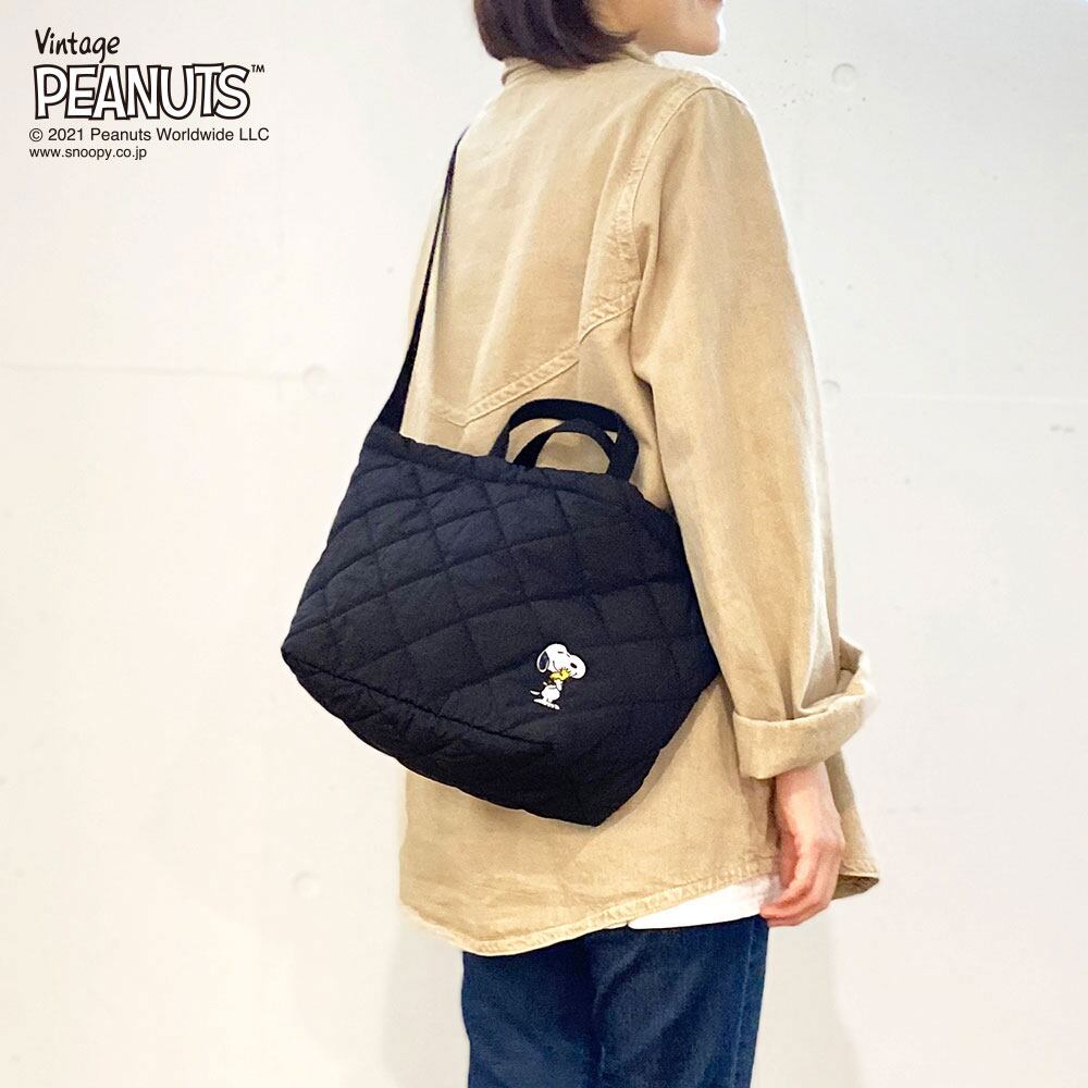 スヌーピーのワンポイント刺繍がかわいい2wayトート。ショルダー付き(取り外し不可)で、トートバッグ・ショルダーバッグとしてお使い頂けます。中綿入りで布地にプクッと立体感が出て、おしゃれでかわいい仕上りに。