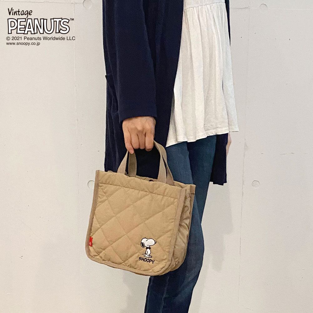 スヌーピーのワンポイント刺繍がかわいい2wayトート。取り外しができるショルダー付きで、トートバッグ・ショルダーバッグとしてお使い頂けます。中綿入りで布地にプクッと立体感が出て、おしゃれでかわいい仕上りに。