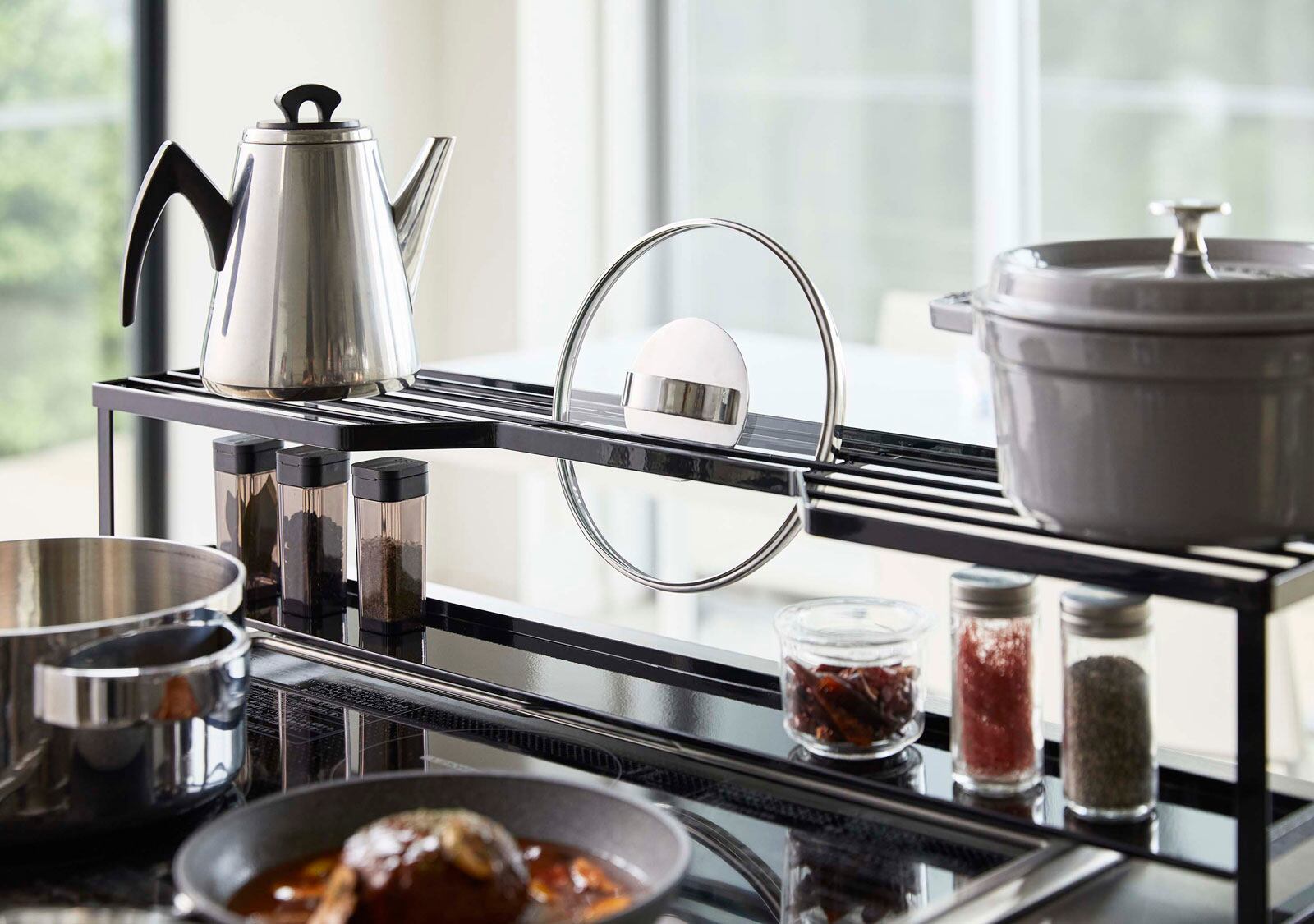 飛び散る油や調理汚れで大変な状況になる前に、TOWER コンロ奥ラック排気口カバー付き 60cmコンロ用を。排気口カバーにはスパイスボトルなどが収納でき、スペースを有効活用します。また、天板には鍋蓋を立てて収納できて、使い勝手いいコンロカバーです。