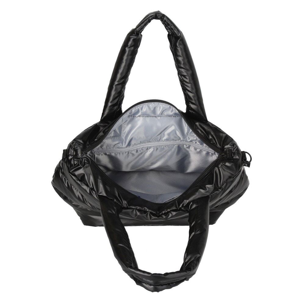 インナーに羽毛を施した、軽さが魅力のレディーストート。両サイドのルーポケットは中で繋がった一つのポケット、左右どちら側からもスマートに中身を出し入れできます。大小3つの内ポケット付きで、小物類の収納も便利。