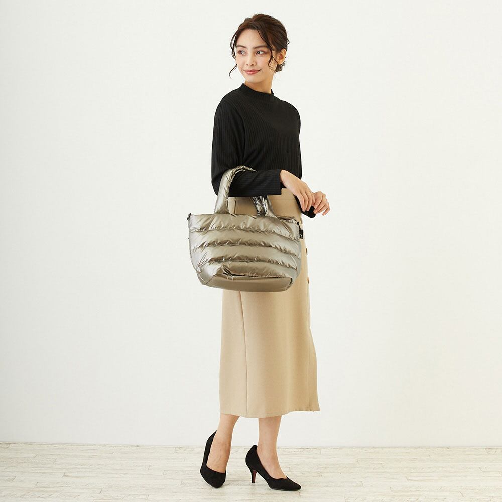 インナーに羽毛を施した、軽さが魅力のレディーストート。両サイドのルーポケットは中で繋がった一つのポケット、左右どちら側からもスマートに中身を出し入れできます。大小3つの内ポケット付きで、小物類の収納も便利。