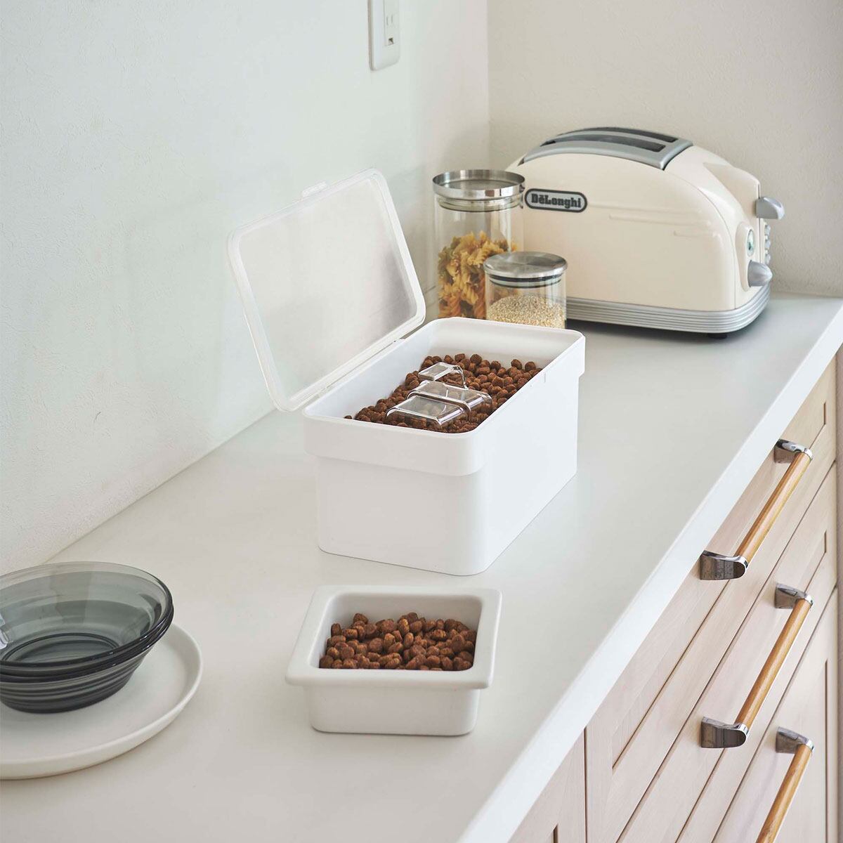 リビングやキッチンにそのまま置けるスタイリッシュなペットフードストッカー。蓋をパチッとロックしておけば、湿気・酸化・臭い漏れを防いでくれます。蓋は全面が開くからペットフードがすくいやすく、残量が分かりやすい透明蓋になっています。