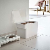 リビングやキッチンにそのまま置けるスタイリッシュなペットフードストッカー。蓋をパチッとロックしておけば、湿気・酸化・臭い漏れを防いでくれます。蓋は全面が開くからペットフードがすくいやすく、残量が分かりやすい透明蓋になっています。