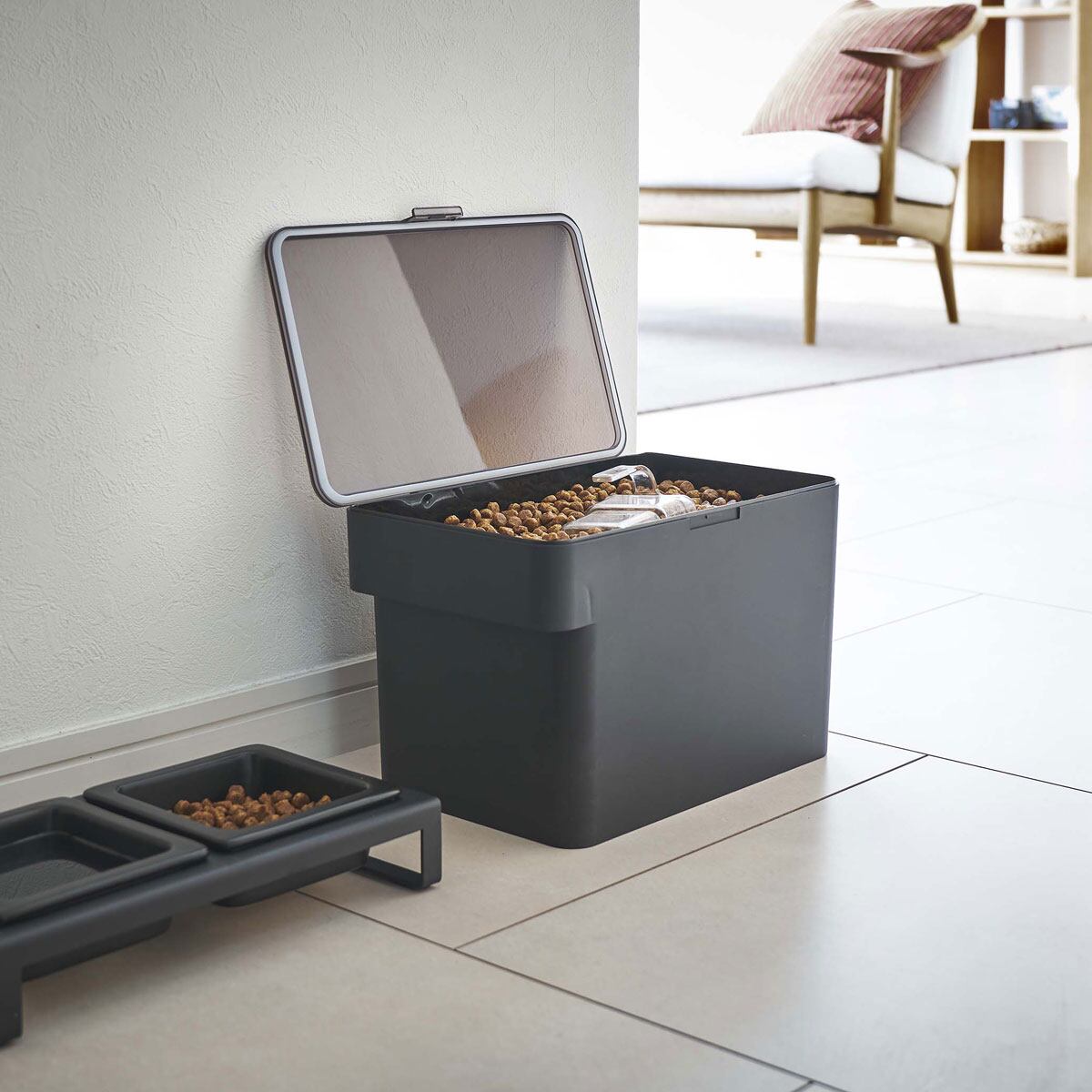 リビングやキッチンにそのまま置けるスタイリッシュなペットフードストッカー。蓋をパチッとロックしておけば、湿気・酸化・臭い漏れを防いでくれます。蓋は全面が開くからペットフードがすくいやすく、残量が分かりやすい透明蓋になっています。
