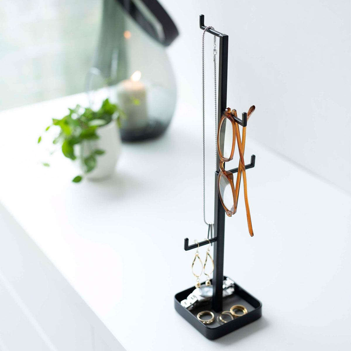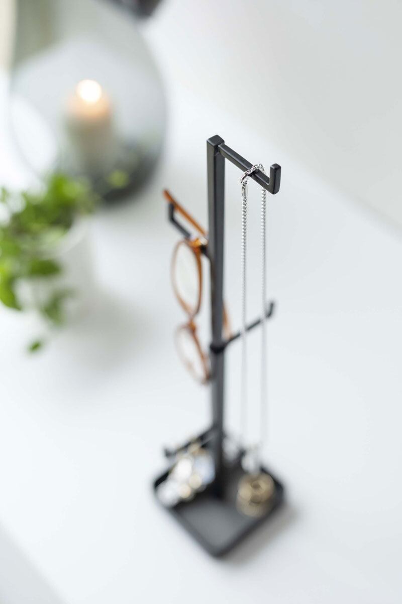 収納力抜群、ディスプレイ感覚で収納できるトレイ付きアクセサリーハンガー。高さ調節ができるので、ロングタイプのネックレス、ブレスレット、サングラスなどを収納できます。トレイは指輪、腕時計などの置き場所として便利です。ハンガーにはイヤリングも掛けられます。