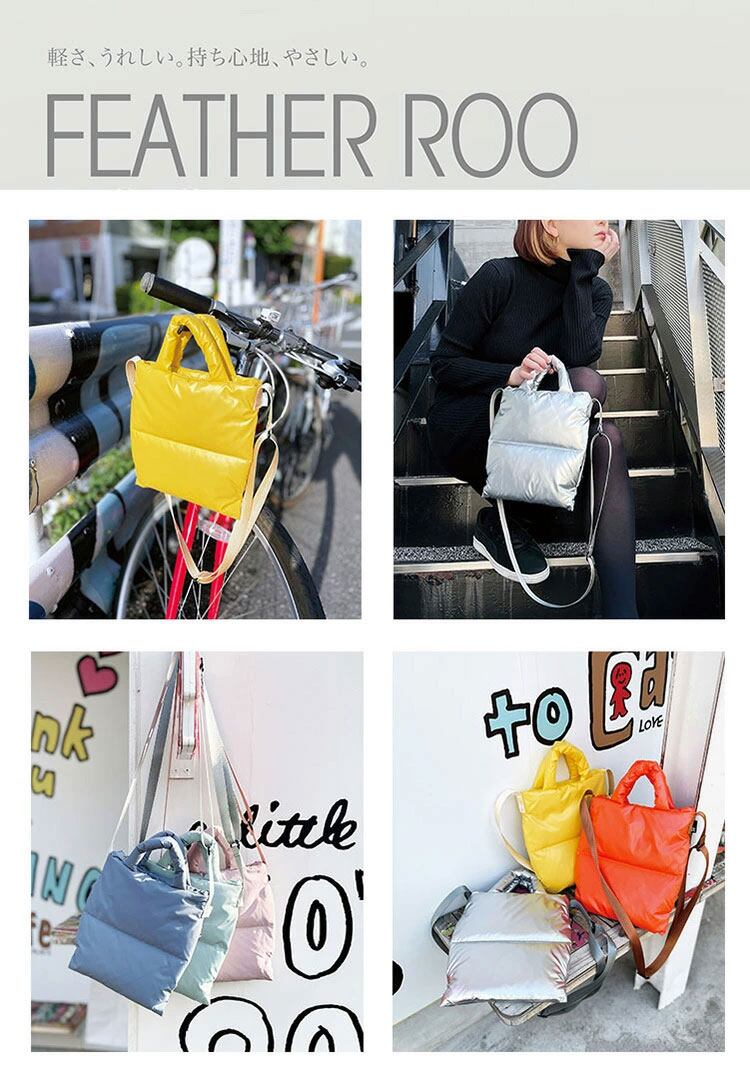 ・主な素材:ポリエステル(表地、裏地、持ち手、ショルダー)/フェザー、ダウン(中綿)/ファスナー(メイン開閉)
