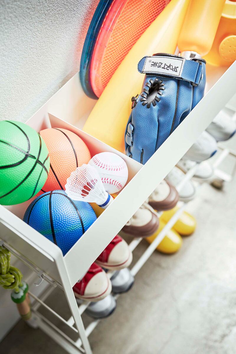 子供の遊具や靴、ボールなどを玄関にスッキリ収納できる玄関収納ラック。小さな子供から大人まで長期間使用できる収納ラックです。付属のフックを使えば、小物の引っ掛け収納ができます。