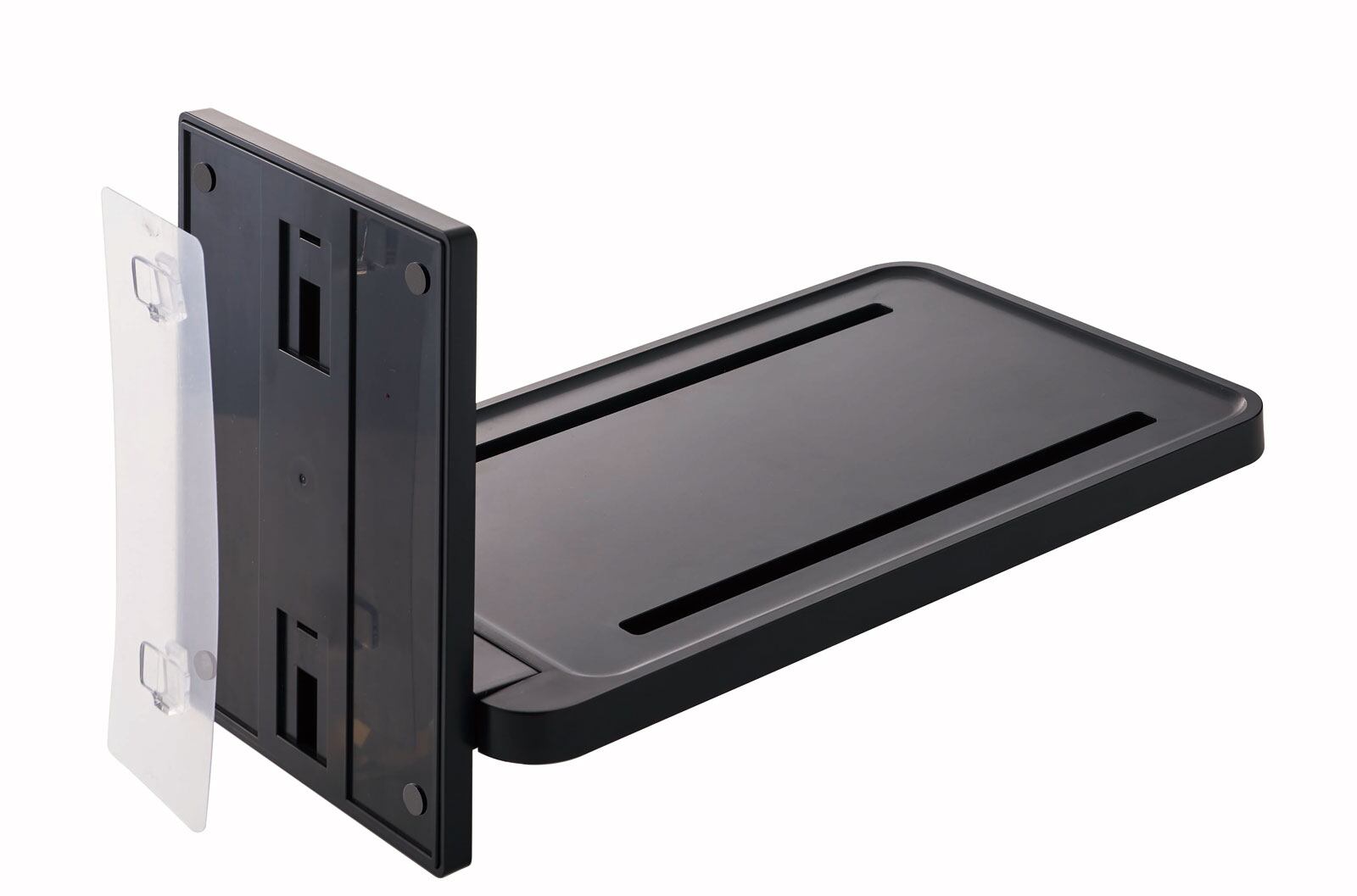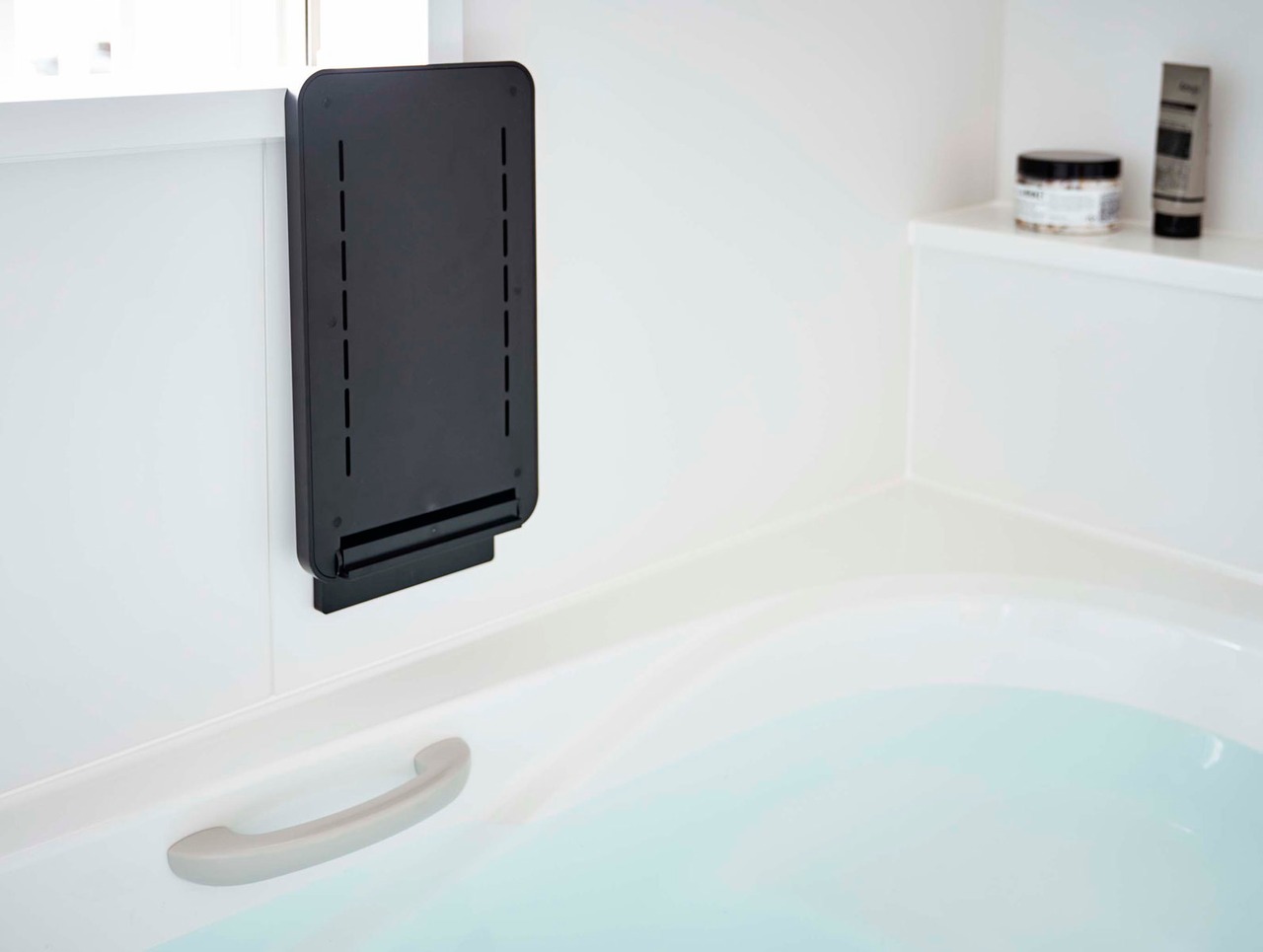 折りたたみ式のバスタブラック。浴室壁面にフィルムフックで付けるだけの簡単設置。ペットボトルや健康グッズの一時置き、スマートフォン・タブレットPCなどを鑑賞しながらのリラックスタイムなど、バスタイムを楽しみたい人におすすめ。使わないときはサッと折りたたみできます。