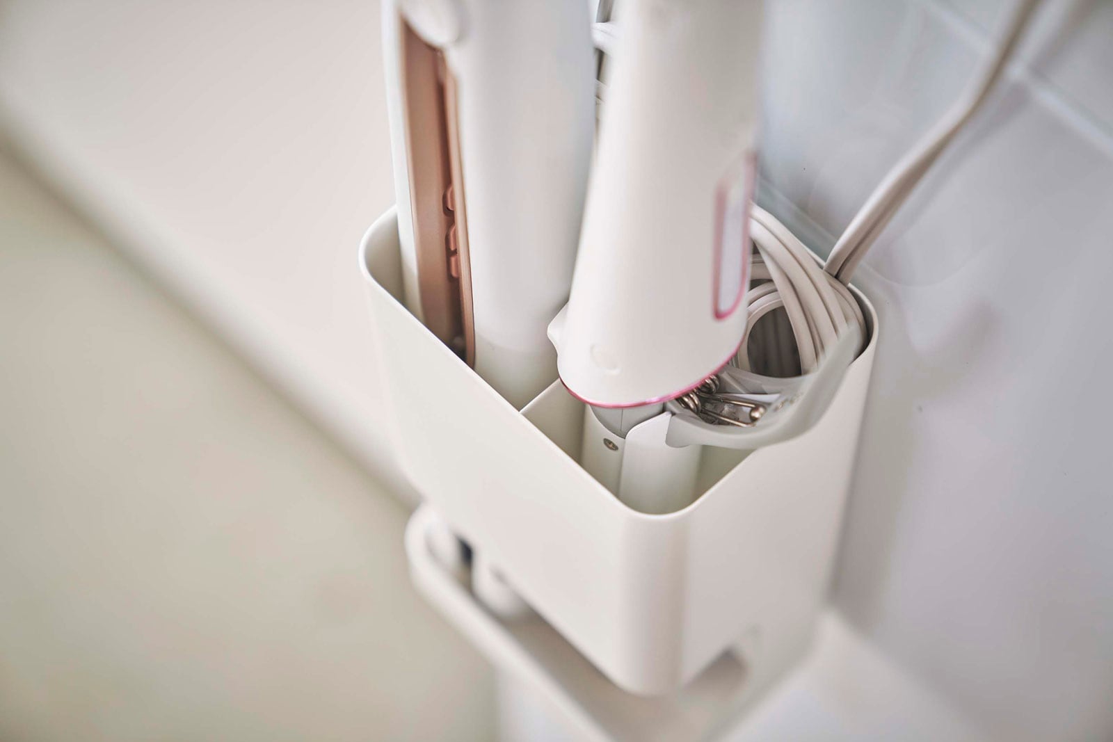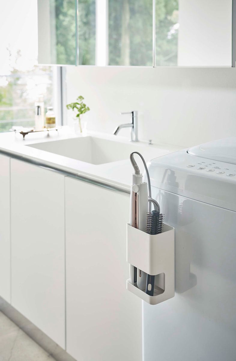 収納場所に困るヘアーアイロンを洗濯機に付けて収納できます。可動式仕切り付きで2種類を同時に収納できます。