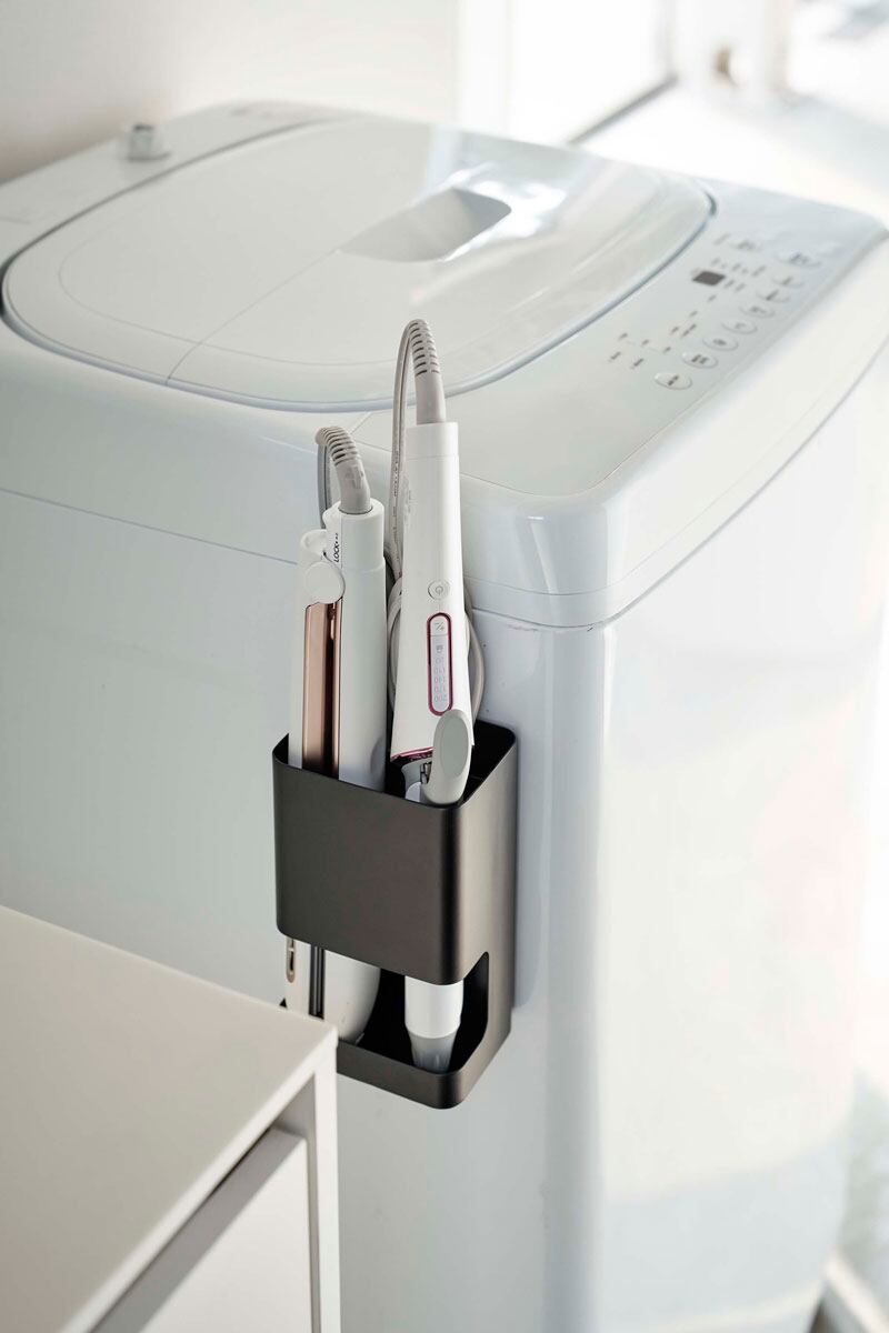 収納場所に困るヘアーアイロンを洗濯機に付けて収納できます。可動式仕切り付きで2種類を同時に収納できます。