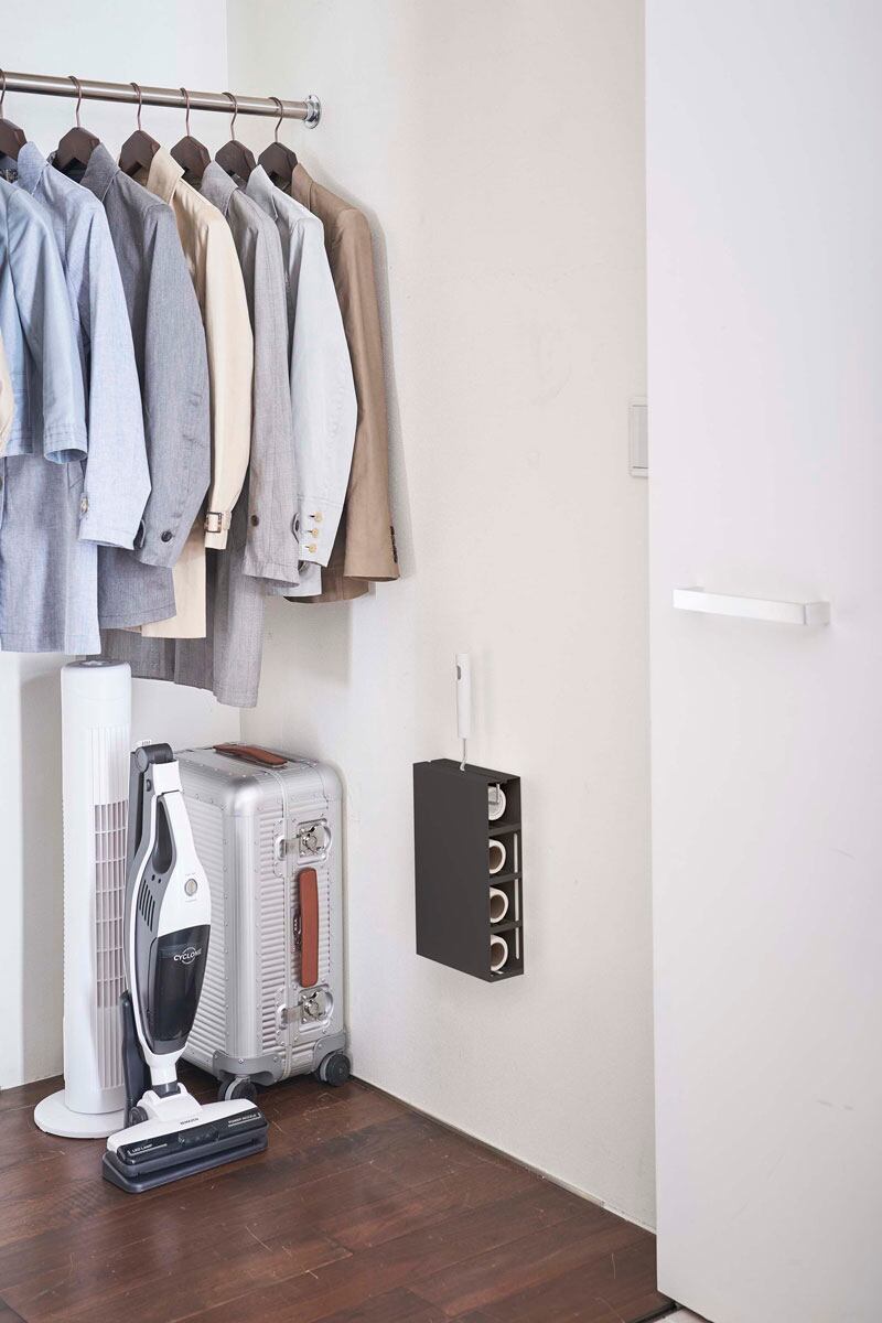 強力マグネットで冷蔵庫や洗濯機に取り付けるだけ、浮かせて収納できるカーペットクリーナースタンド。横からスライドして入れるので粘着面にほこりが付きにくい構造になってます。付属の木ネジで壁にも取り付けられます。