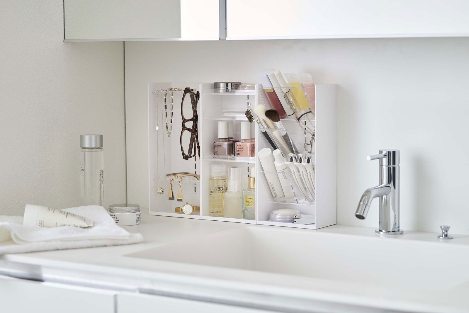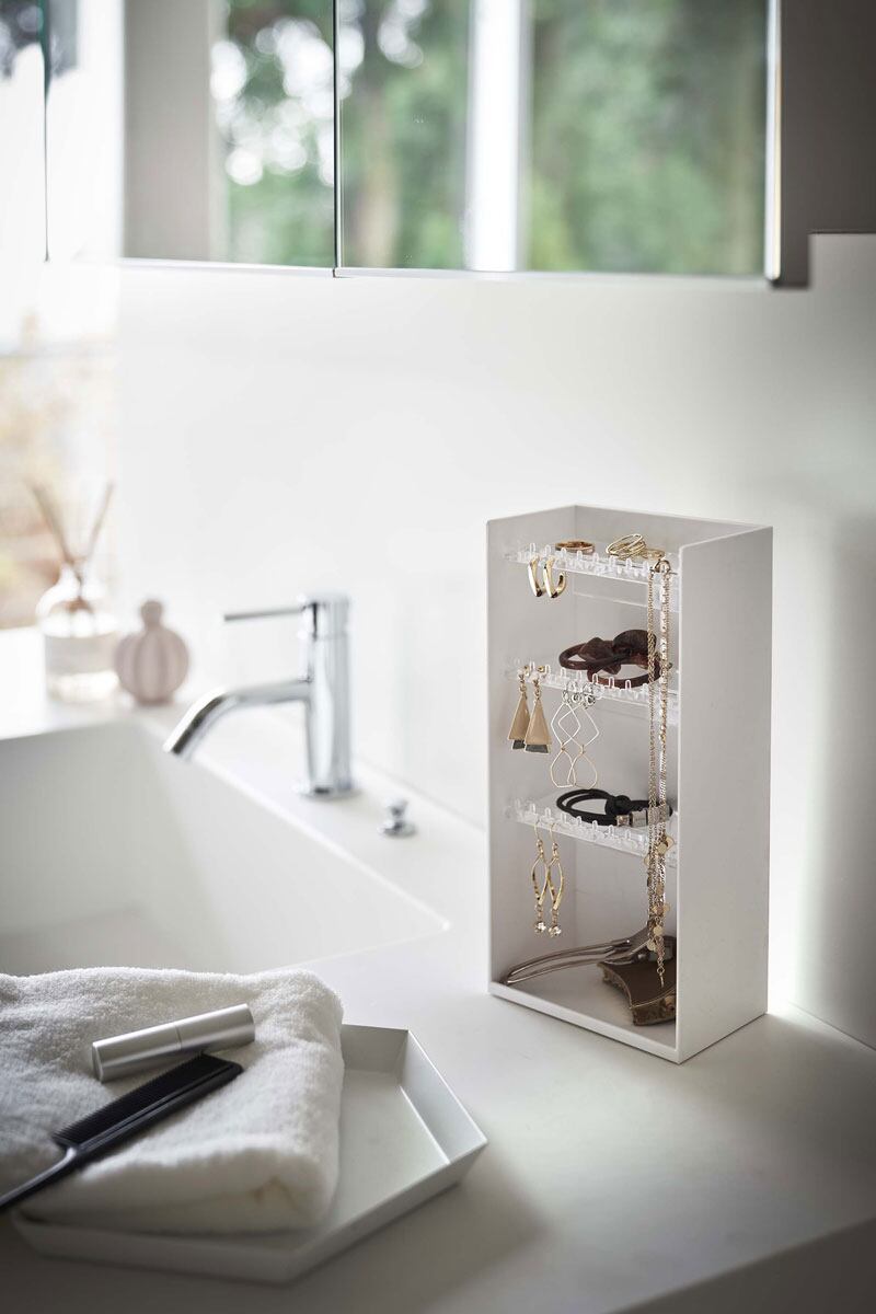 洗面周りにアクセサリーをまとめて一括収納。トレーが透明のため、中身が見やすく整理も簡単。フックにはピアスやイヤリング、ネックレスを。トレーには指輪や時計、ブレスレットなどをディスプレイしながら収納できます。