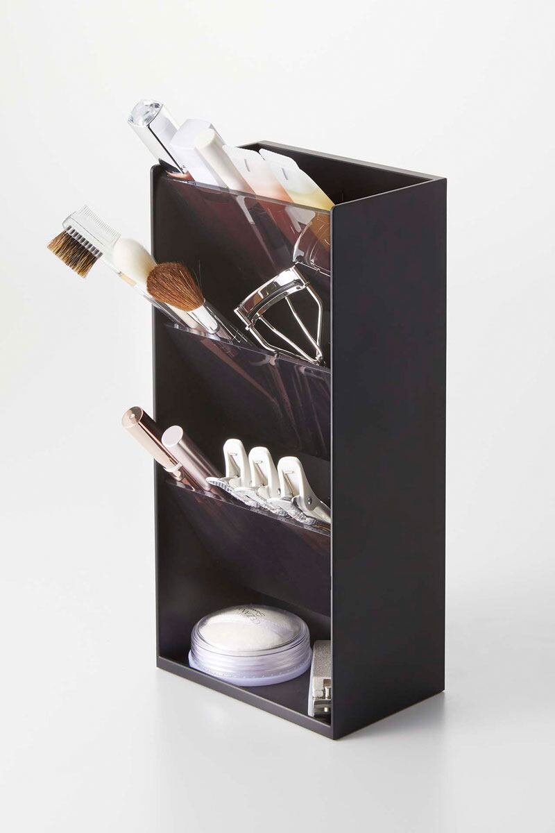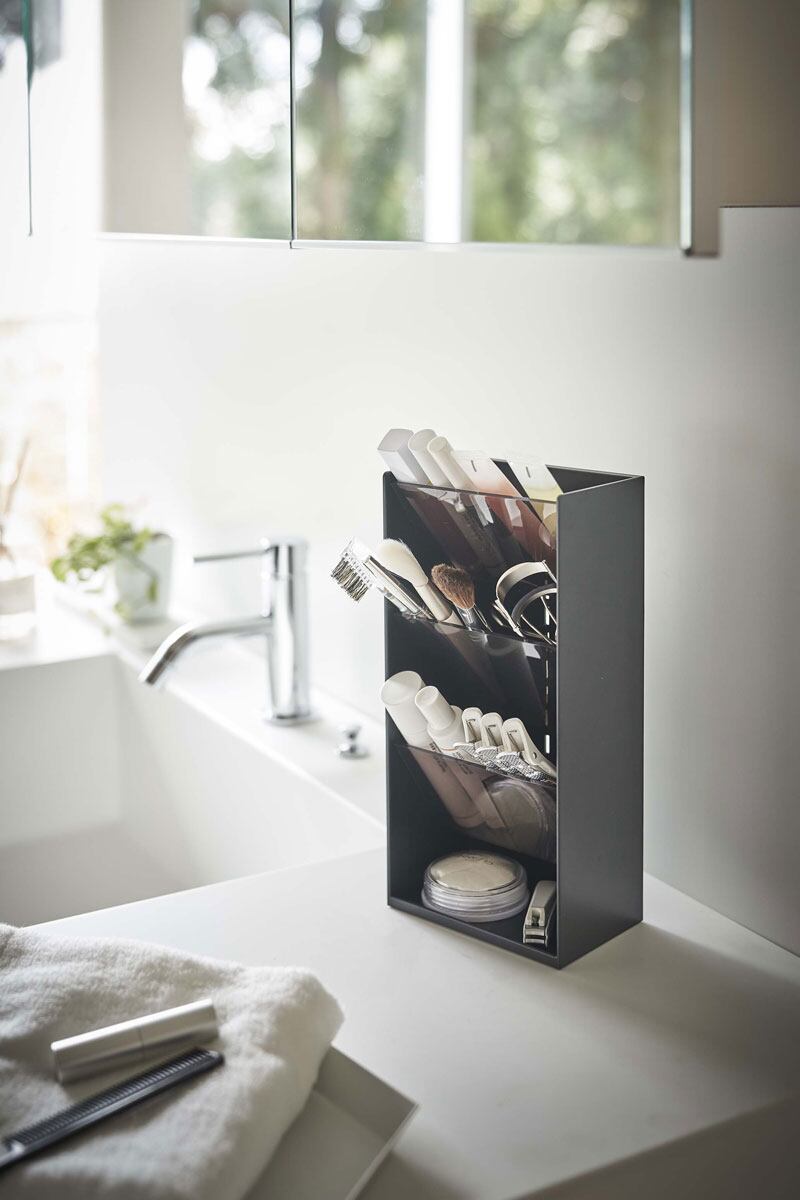洗面周りにコスメをまとめて一括収納。トレーが透明のため、中身が見やすく整理も簡単です。メイクブラシ・リップ・アイライナーなどを取り出しやすいように斜めに収納できます。