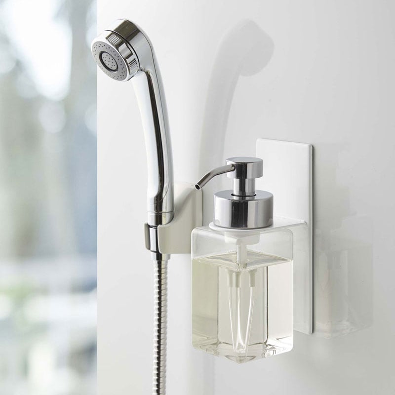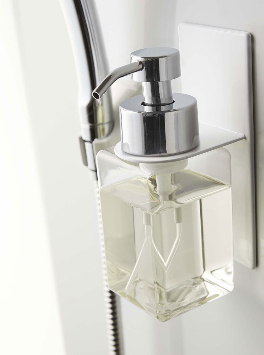泡タイプのディスペンサーを強力マグネットでお好きな位置に設置できるホルダー。宙に浮かせられるから、ボトルの底がぬめらず衛生的です。そのままポンプを押すこともできて便利です。