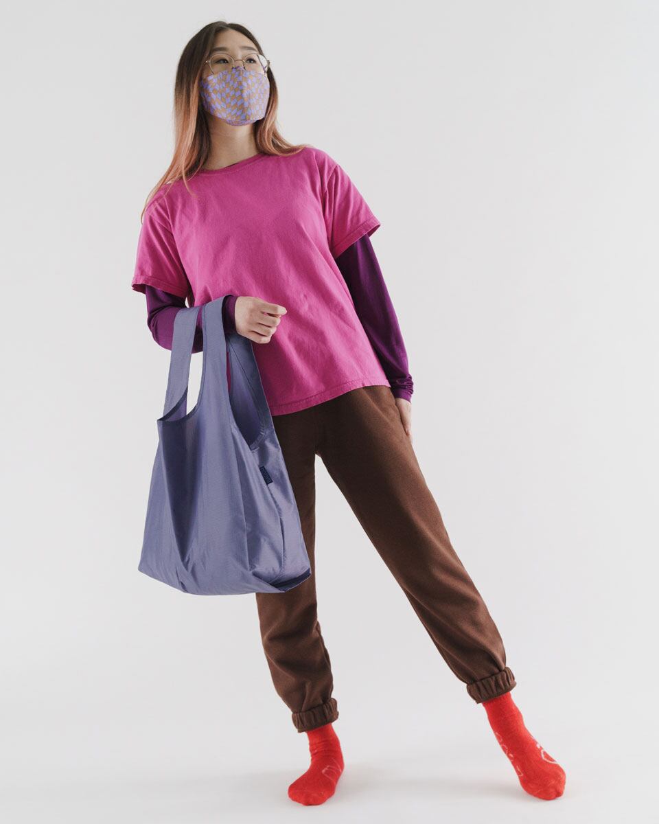 カリフォルニア生まれのBAGGUより、もっとも売れている定番サイズ。ショッピングをはじめ、レジャーやジムなどのシーンにもおすすめ。付属の専用ポーチには、折りたたんだスタンダードバグゥを入れて持ち運べます。