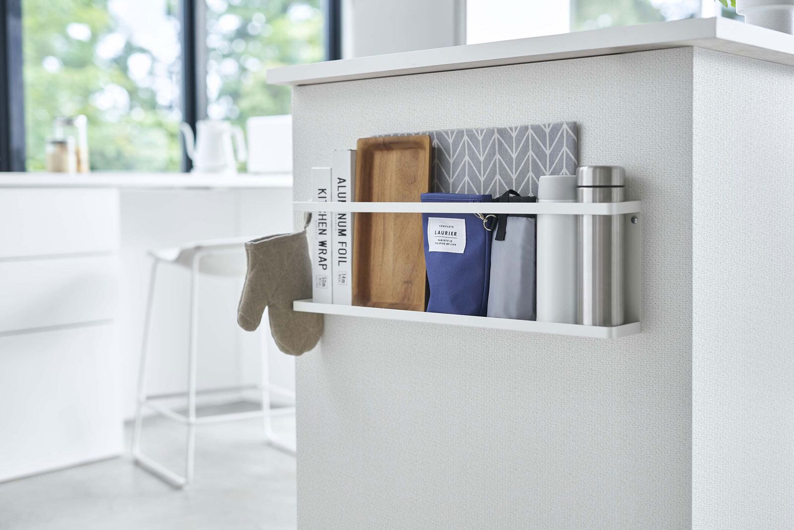 キッチンカウンターの側面やダイニング側に付けられる便利な収納ラック。穴が目立たない石こうボードピンが付いているので、取り付け部の穴も目立ちません。