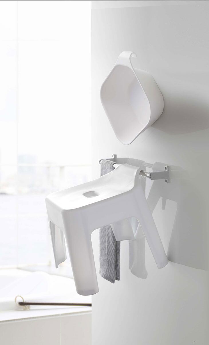 浴室のタオルバーなどに掛けて乾かせるフック付き風呂イス。背もたれ付きでゆったり座れます。