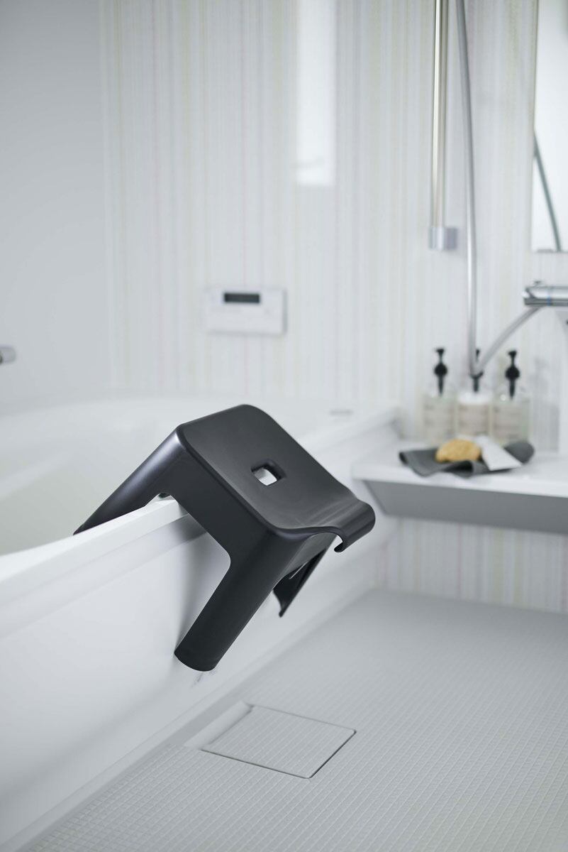 浴室のタオルバーなどに掛けて乾かせるフック付き風呂イス。背もたれ付きでゆったり座れます。