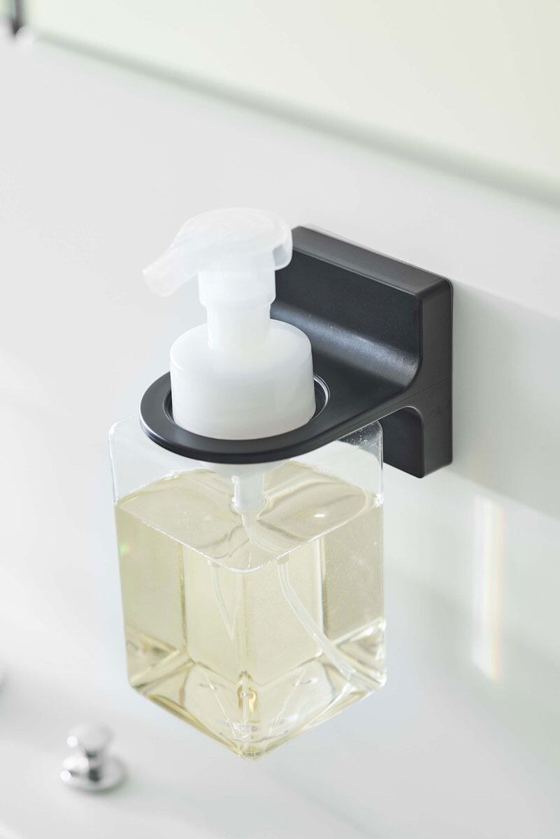 泡タイプ用ソープディスペンサーをお好きな位置に設置できるホルダー。浴室のタイル面や洗面壁面などにフィルムフックで簡単取り付け。宙に浮かせられるから、ボトルの底がぬめらず衛生的です。