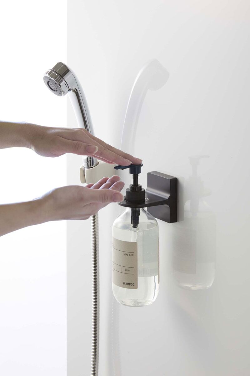 ソープディスペンサーをお好きな位置に設置できるホルダー。浴室のタイル面や洗面壁面などにフィルムフックで簡単取り付け。宙に浮かせられるから、ボトルの底がぬめらず衛生的です。