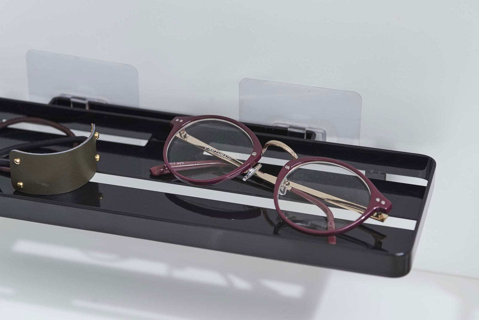 貼って剥がせるフィルムフックで好きな位置に設置できるサニタリーラック。ワイドサイズで歯ブラシや歯磨き粉、タンブラーなどを一括収納します。浮かせて収納できるから掃除も簡単です。