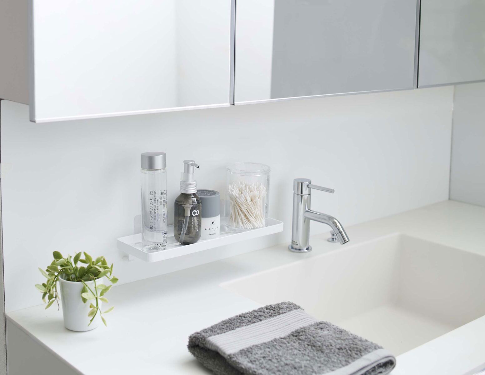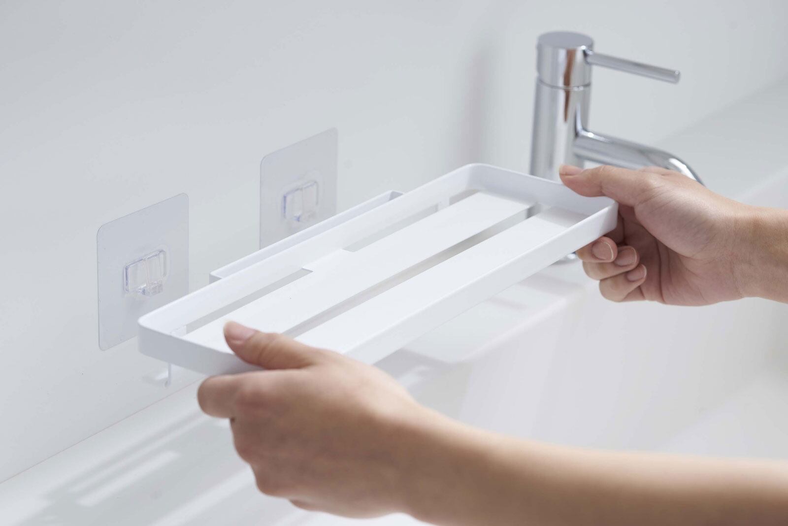 貼って剥がせるフィルムフックで好きな位置に設置できるサニタリーラック。ワイドサイズで歯ブラシや歯磨き粉、タンブラーなどを一括収納します。浮かせて収納できるから掃除も簡単です。