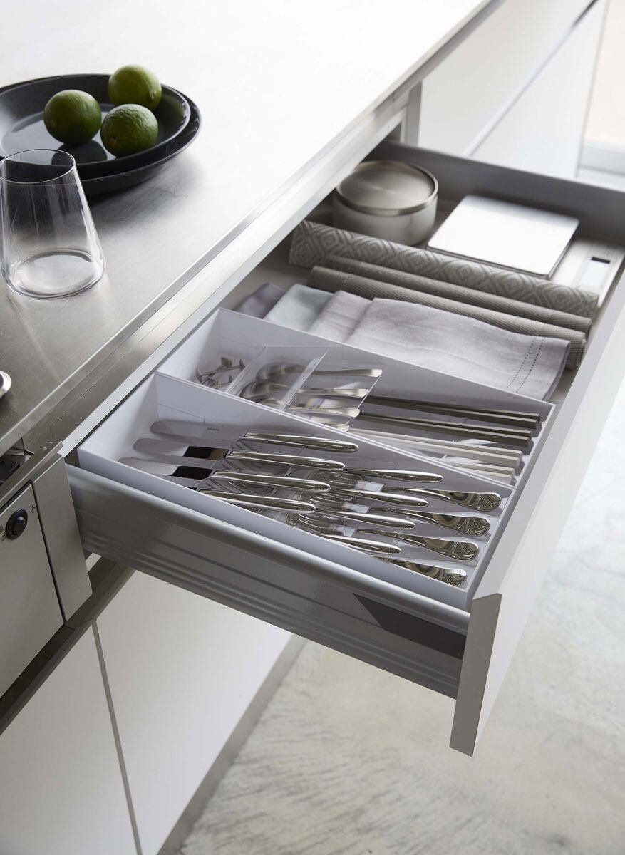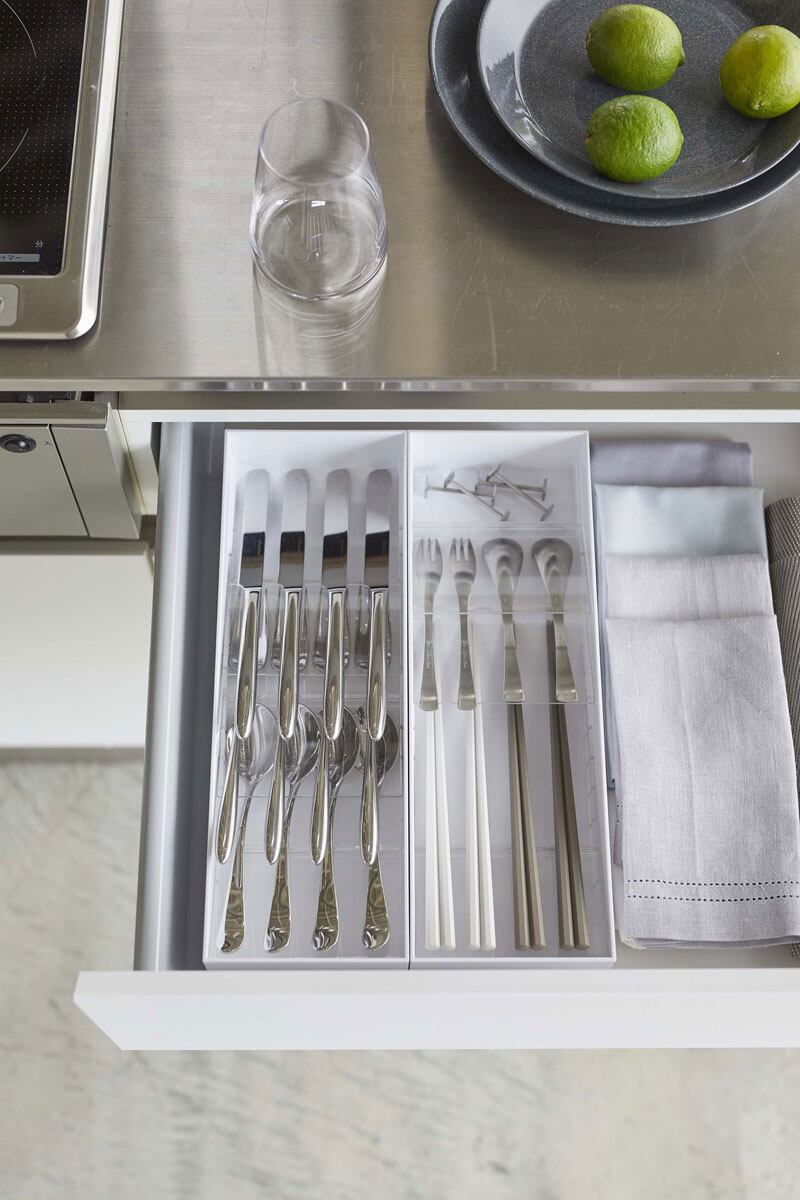 斜めの仕切りでカトラリーを重ねて収納できるので、収納スペースを効率よく使えます。仕切りはカトラリーのサイズに合わせて約2cmごとに調整でき、下に収納したカトラリーが分かりやすいように、仕切りは透明になっています。