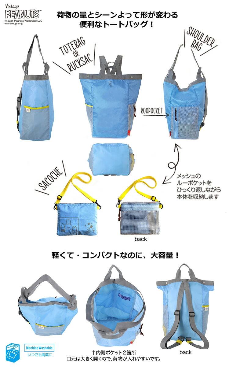 サイドのルーポケットに本体を収納するとサコッシュに。荷物が増えたときにはサッと広げてマルチウェイトートに。トートはもちろん、シーンに応じて、リュックやショルダーにも。いろいろな持ち方で使用ができる万能バッグです。