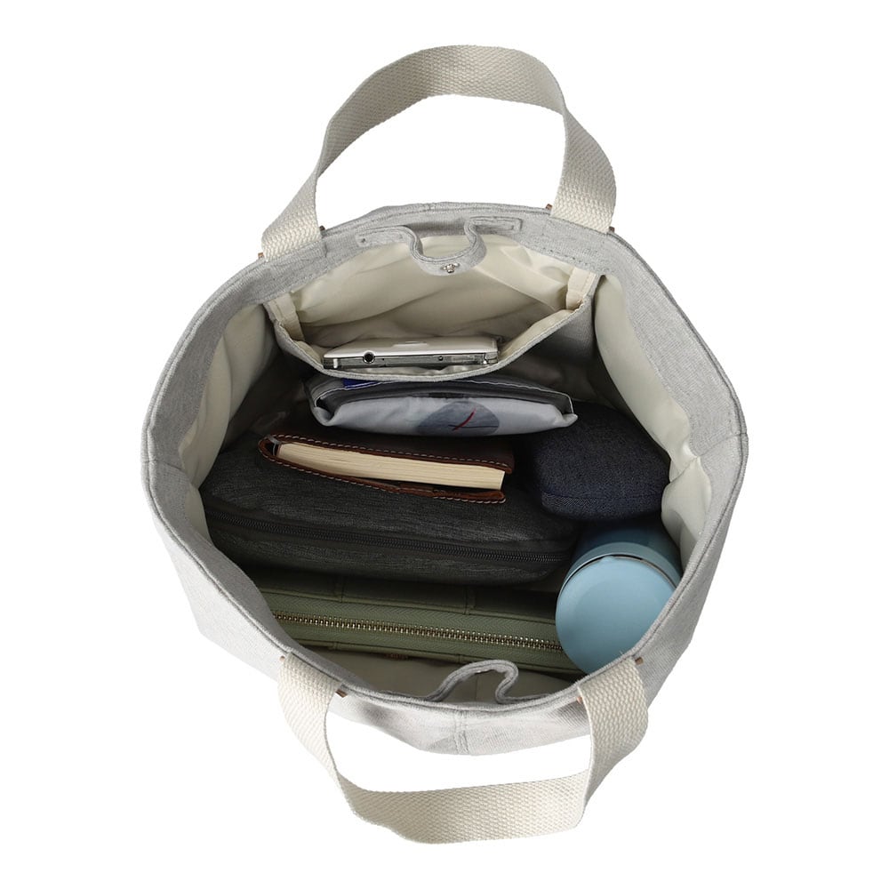 オリジナルの織り生地を使用した、ナチュラルでリラックス感のあるトートバッグ。開き口が広くモノの出し入れがしやすく、中身もパッと確認できます。内ポケットは小物入れとして、サイドにあるファスナー付き外ポケットは、鍵やスマホ、マスクなどを入れておけるので便利です。