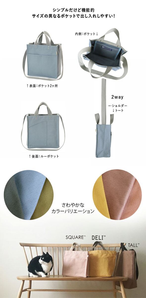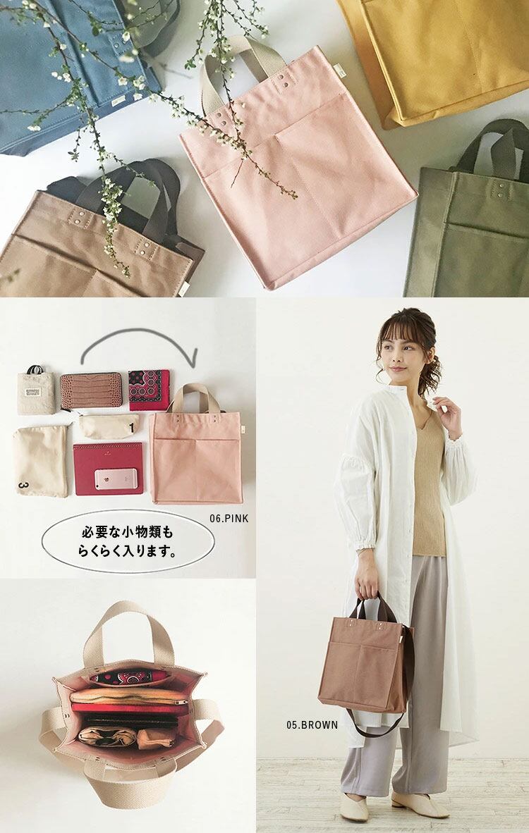 ・主な素材:綿 はっ水加工(表地)/綿 ノンフタル酸PVC加工(裏地)/ポリエステル、綿(持ち手、ショルダー)
