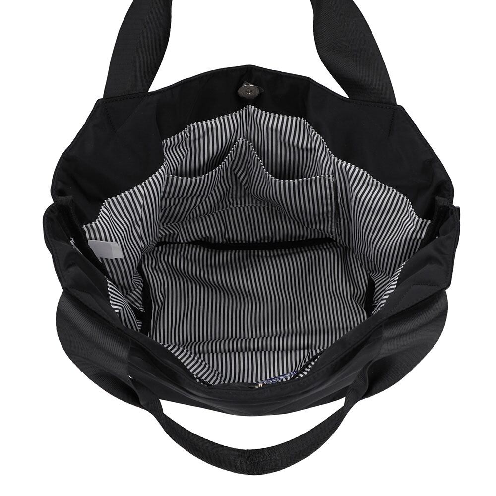 光沢感のあるナイロン生地で高級感のあるつくり、大人っぽさのある魅力的なトートです。ちらりと見えるストライプ柄の裏地で、視覚的な楽しさと遊び心もプラス。開き口が広くモノの出し入れがしやすく、中身もパッと確認できます。ファスナー付き外ルーポケットは、鍵やスマホ、マスクなどの収納に便利です。