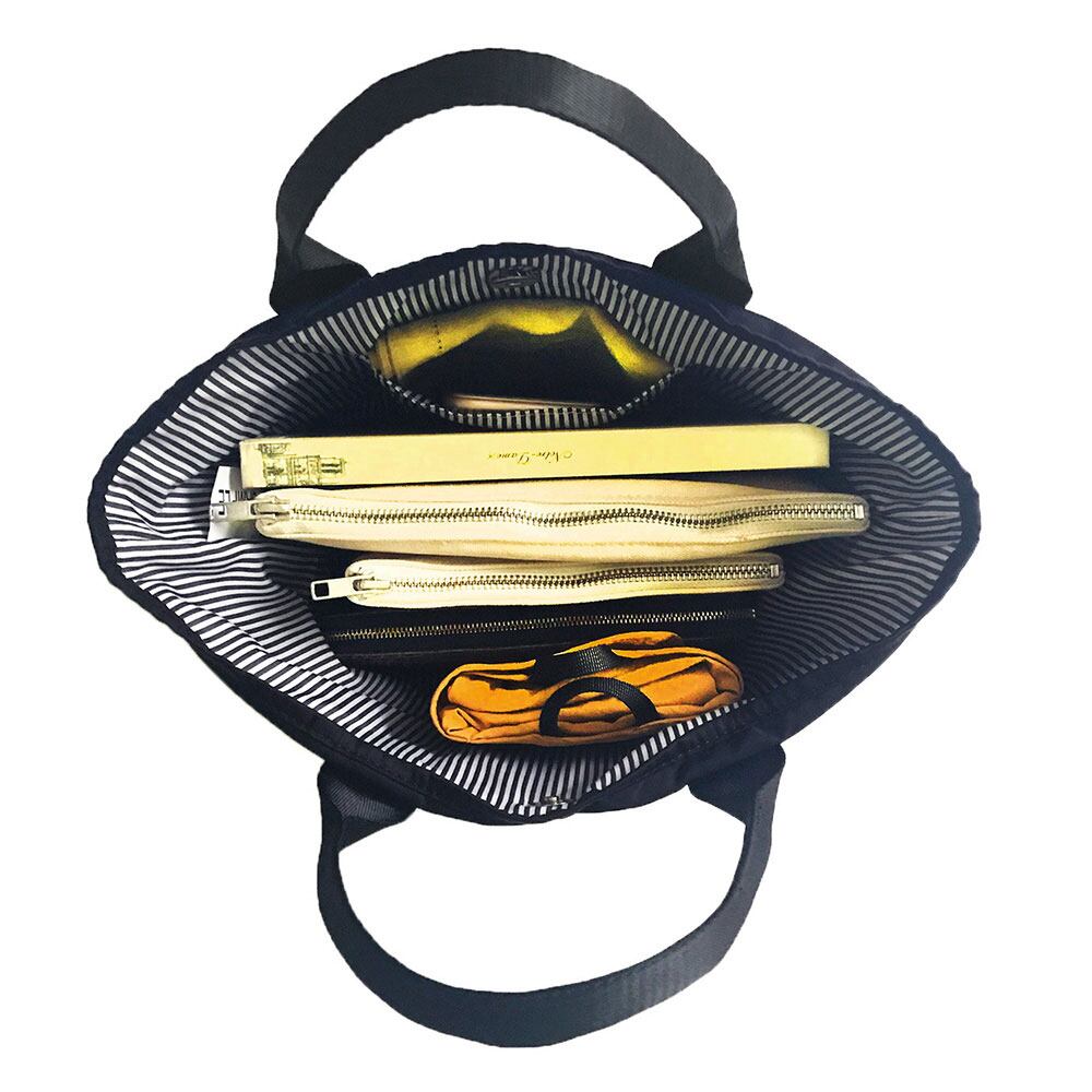 光沢感のあるナイロン生地で高級感のあるつくり、大人っぽさのある魅力的なトートです。ちらりと見えるストライプ柄の裏地で、視覚的な楽しさと遊び心もプラス。底マチが広く、ランチボックスなども入ります。便利な2つの外ポケットは、パスケース、ハンドクリームや消臭スプレーなどの小物の収納に便利です。