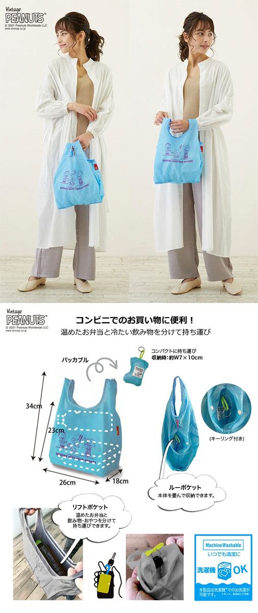 温めたお弁当と冷たい飲み物などを分けて持ち運べるリフトポケット付きエコバッグ。底マチたっぷりでコンビニでのお買い物に便利なサイズ。リング付きなので、キーホルダーとして鍵などをつけて、スマホとルーショッパーだけでお出かけできます。
