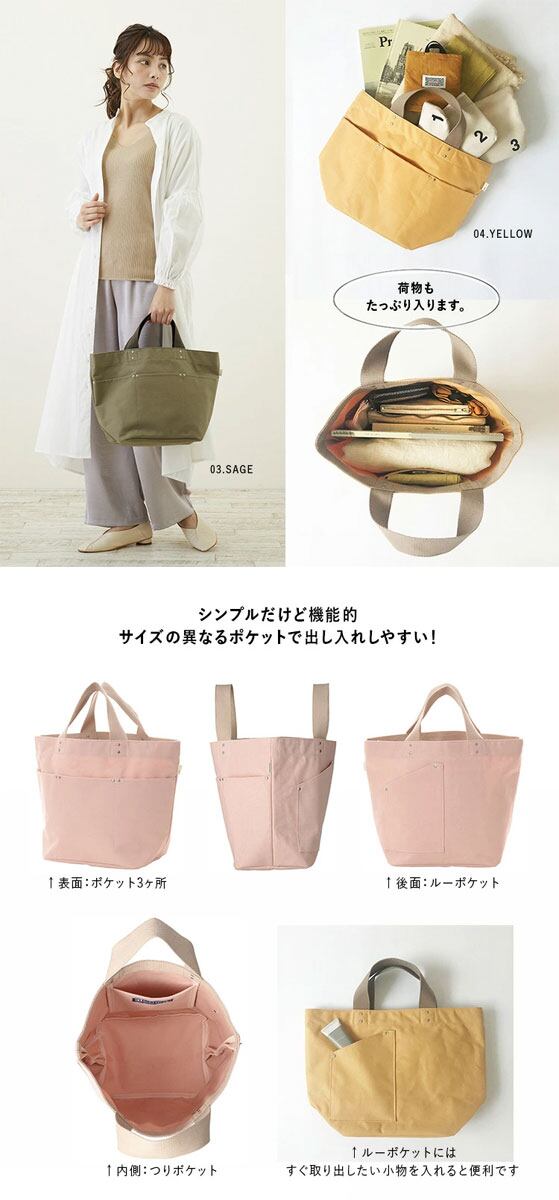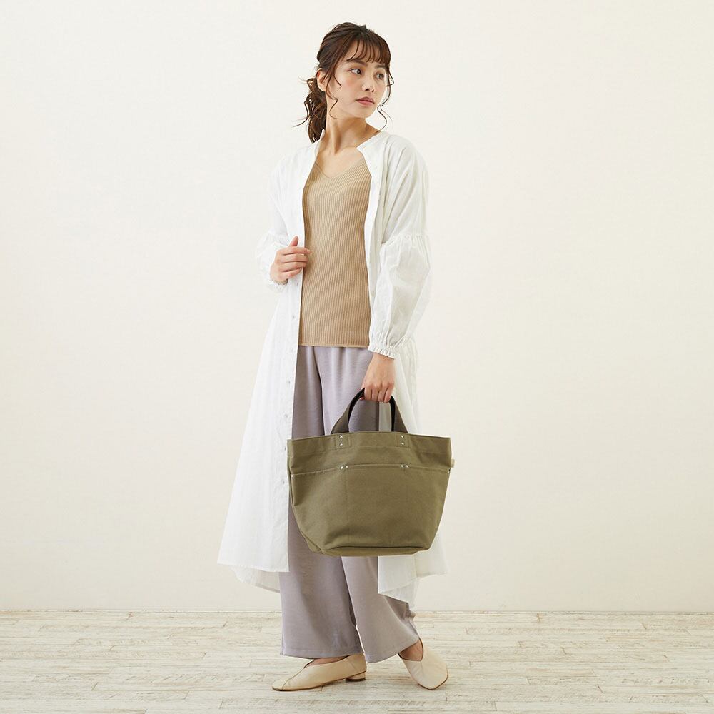 摩擦に強く丈夫なコットンキャンバスに、はっ水加工を施したレディーストート。サブバッグでもメインでも使える人気のサイズ。A4サイズの書類、ランチボックス、ボトル、折りたたみ傘、コスメポーチなどもらくらく収納します。