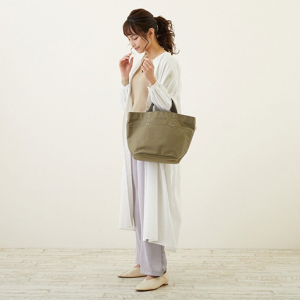 摩擦に強く丈夫なコットンキャンバスに、はっ水加工を施したレディーストート。サブバッグでもメインでも使える人気のサイズ。A4サイズの書類、ランチボックス、ボトル、折りたたみ傘、コスメポーチなどもらくらく収納します。