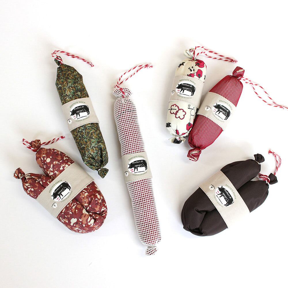 フランスの肉屋に吊るされたソーセージをイメージ、インパクト大のユニークなエコバッグです。使わないときは、ディスプレーして楽しめます。