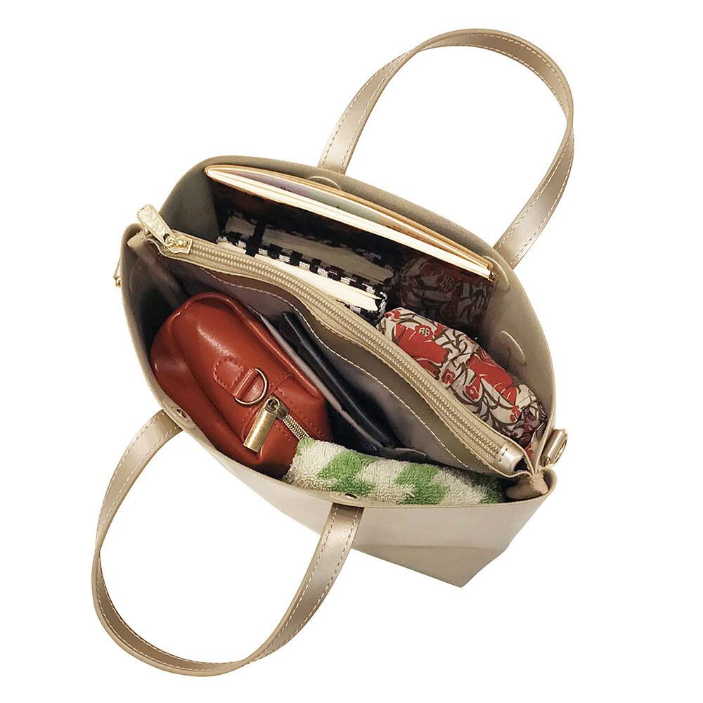 軽くてコンパクトな、きれいめトート。カジュアルにもきれいめにも使用できて、オンオフ問わずに大活躍。本革のような質感の軽量なエコレザーで、上品でしっかりした仕上がりに。長さ調整、取り外しができるショルダー付きで、肩掛けや、斜めがけなど、両手をふさぐことなく使用できます。