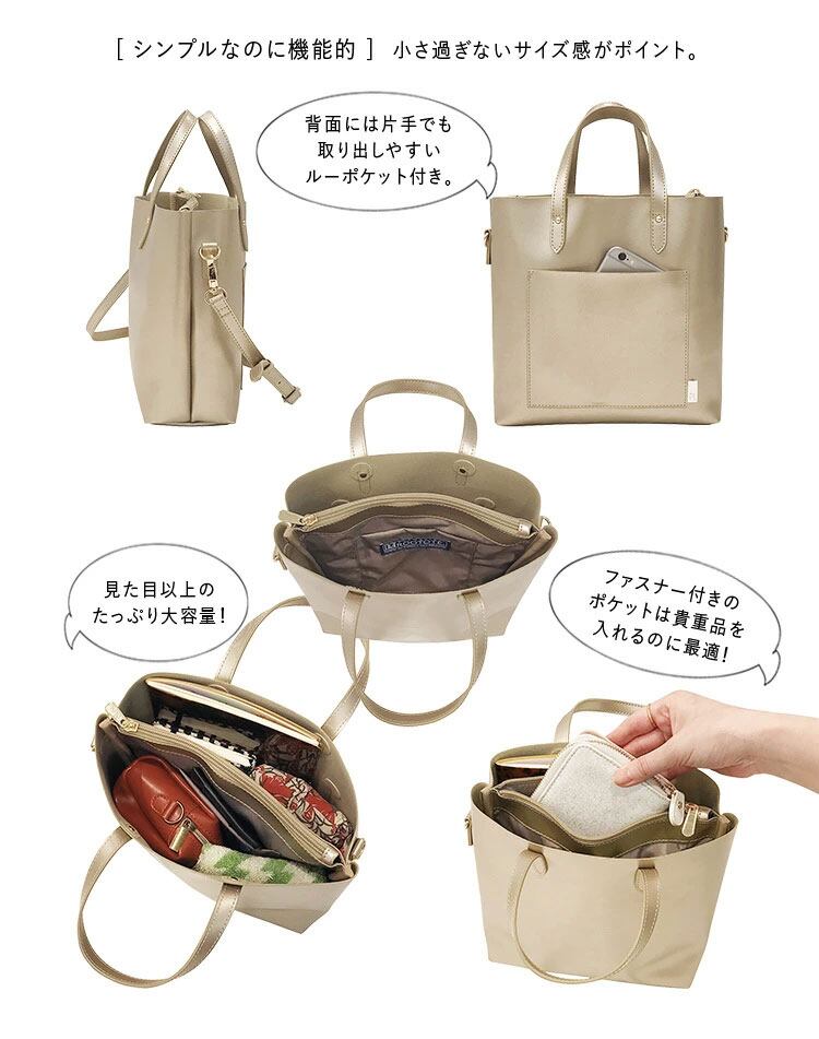 軽くてコンパクトな、きれいめトート。カジュアルにもきれいめにも使用できて、オンオフ問わずに大活躍。本革のような質感の軽量なエコレザーで、上品でしっかりした仕上がりに。長さ調整、取り外しができるショルダー付きで、肩掛けや、斜めがけなど、両手をふさぐことなく使用できます。